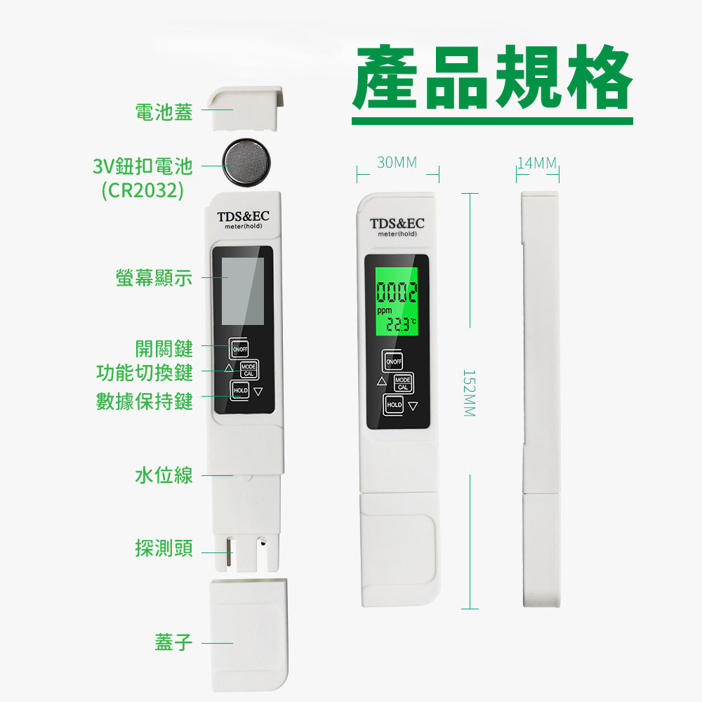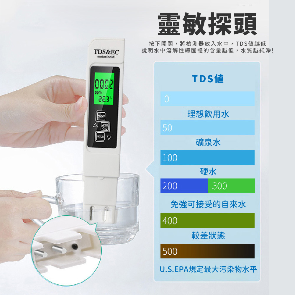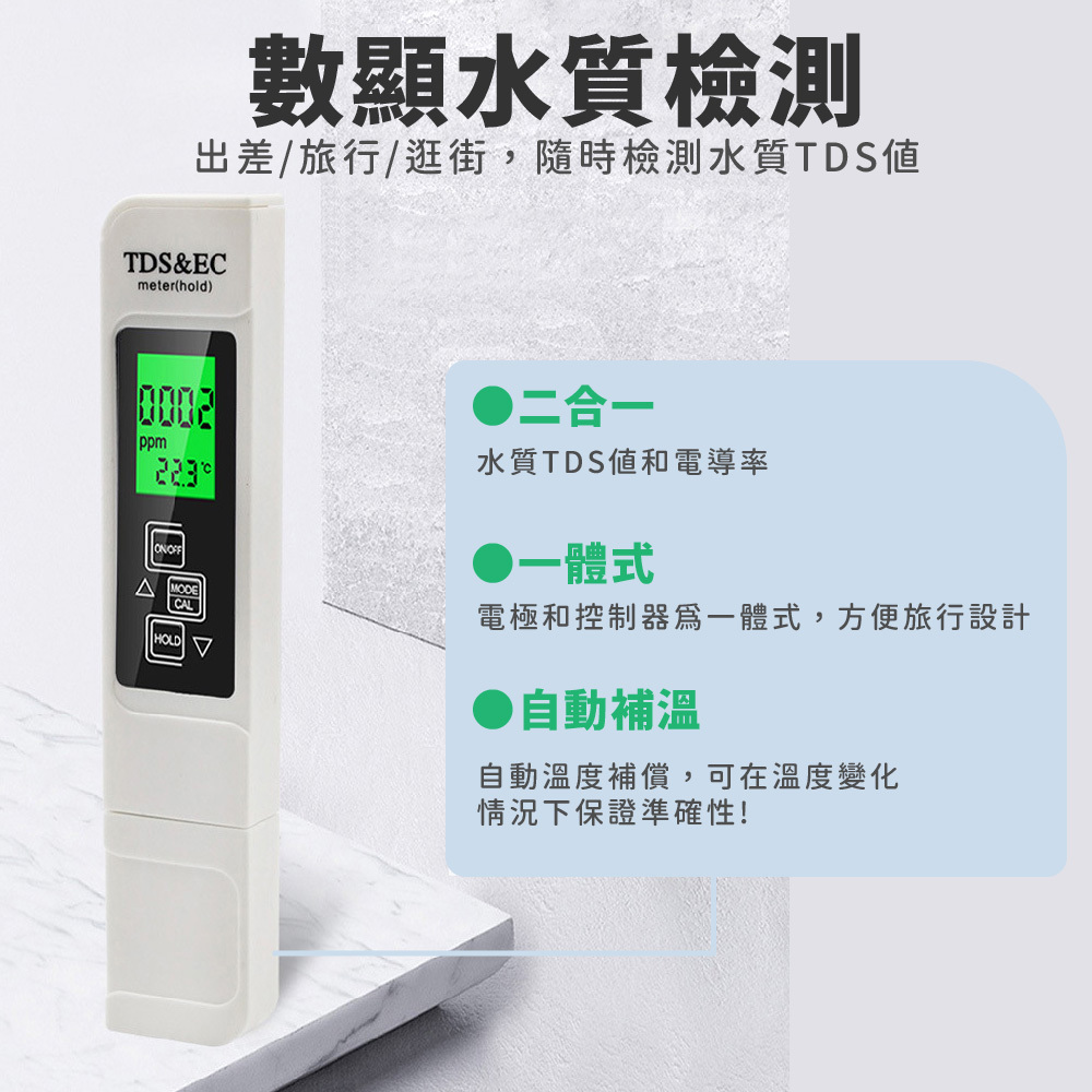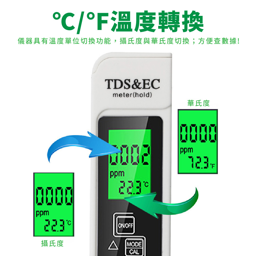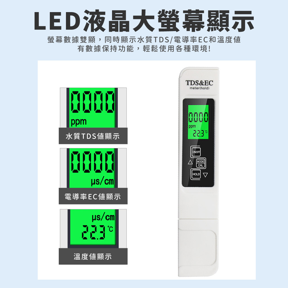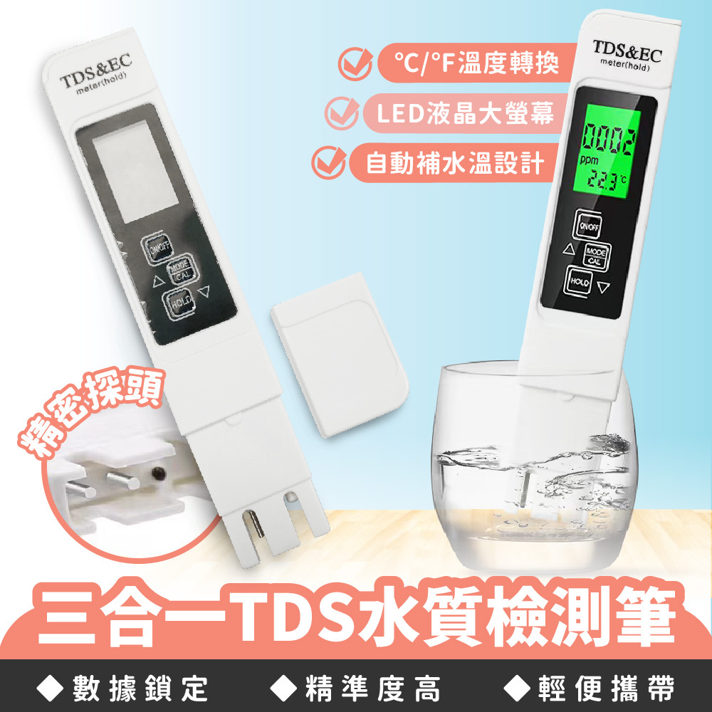 ✔️ 三合一功能:同時檢測 TDS值(總溶解固體)、EC值(電導率) 及 水溫