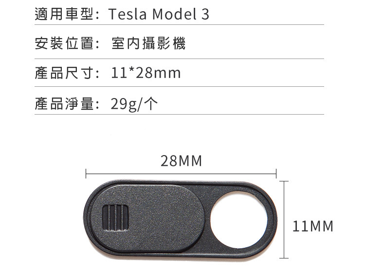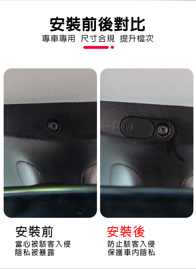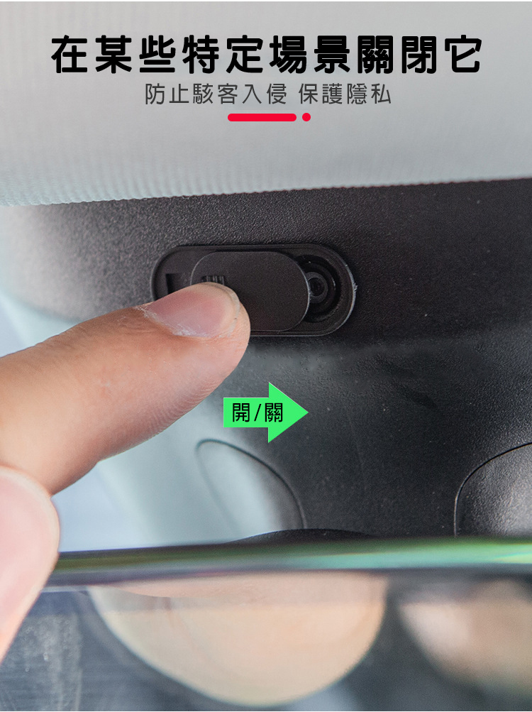 車內攝影頭保護蓋,專為Tesla Model 3 設計,輕鬆遮蔽車內攝影機,避免隱私洩露與駭客入侵風險。滑蓋設計,操作簡單,可依需求開啟或關閉,適用於特定場合如會議、休息等,確保個人空間不受干擾。精密貼合、不影響原車內裝,是特斯拉車主必備的隱私防護配件!