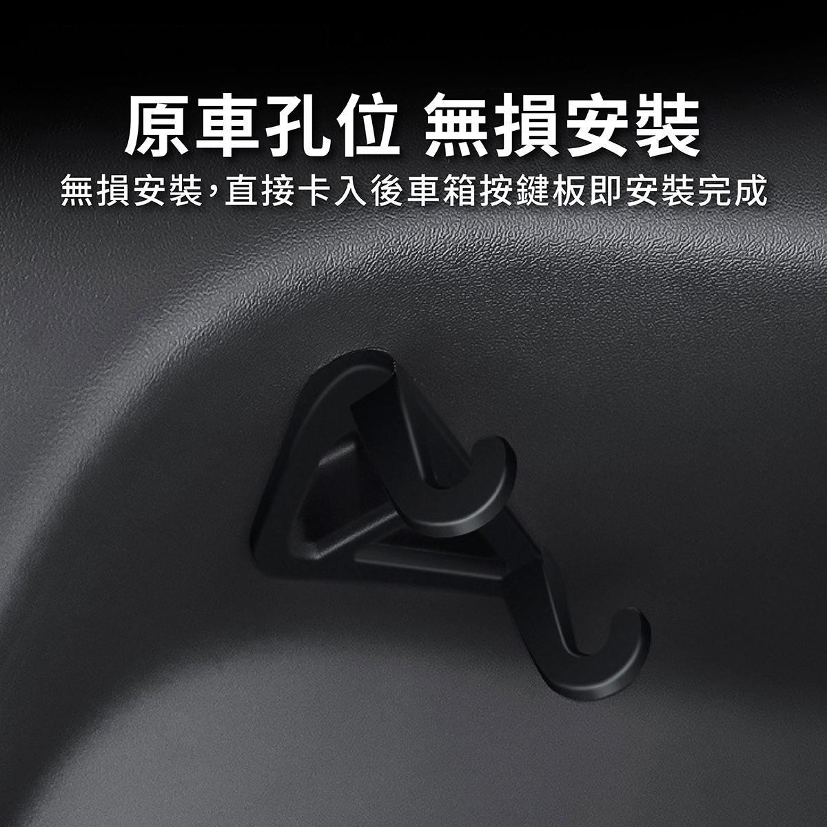 特斯拉後車箱掛勾專為Tesla Model Y設計,原車掃描開模,完美貼合後車廂按鍵板,無損安裝不影響車輛功能。一體成形ABS材質,堅固耐用,具備5KG強力承重,輕鬆吊掛購物袋、背包、雨傘等物品,讓後車廂收納更整潔有序。小巧輕盈,不占車內空間,簡單安裝即可使用,是特斯拉車主的實用收納配件,提升行車便利性。