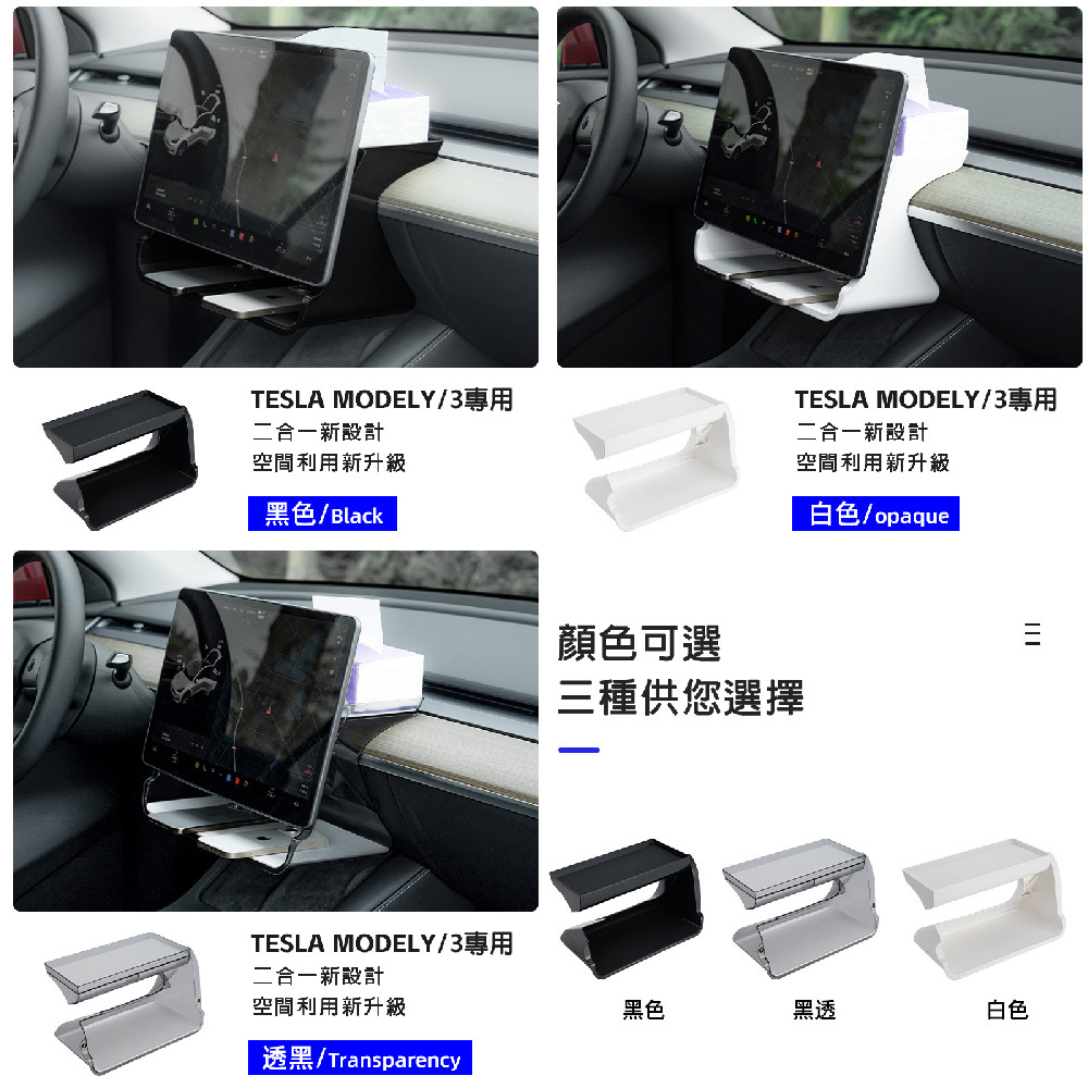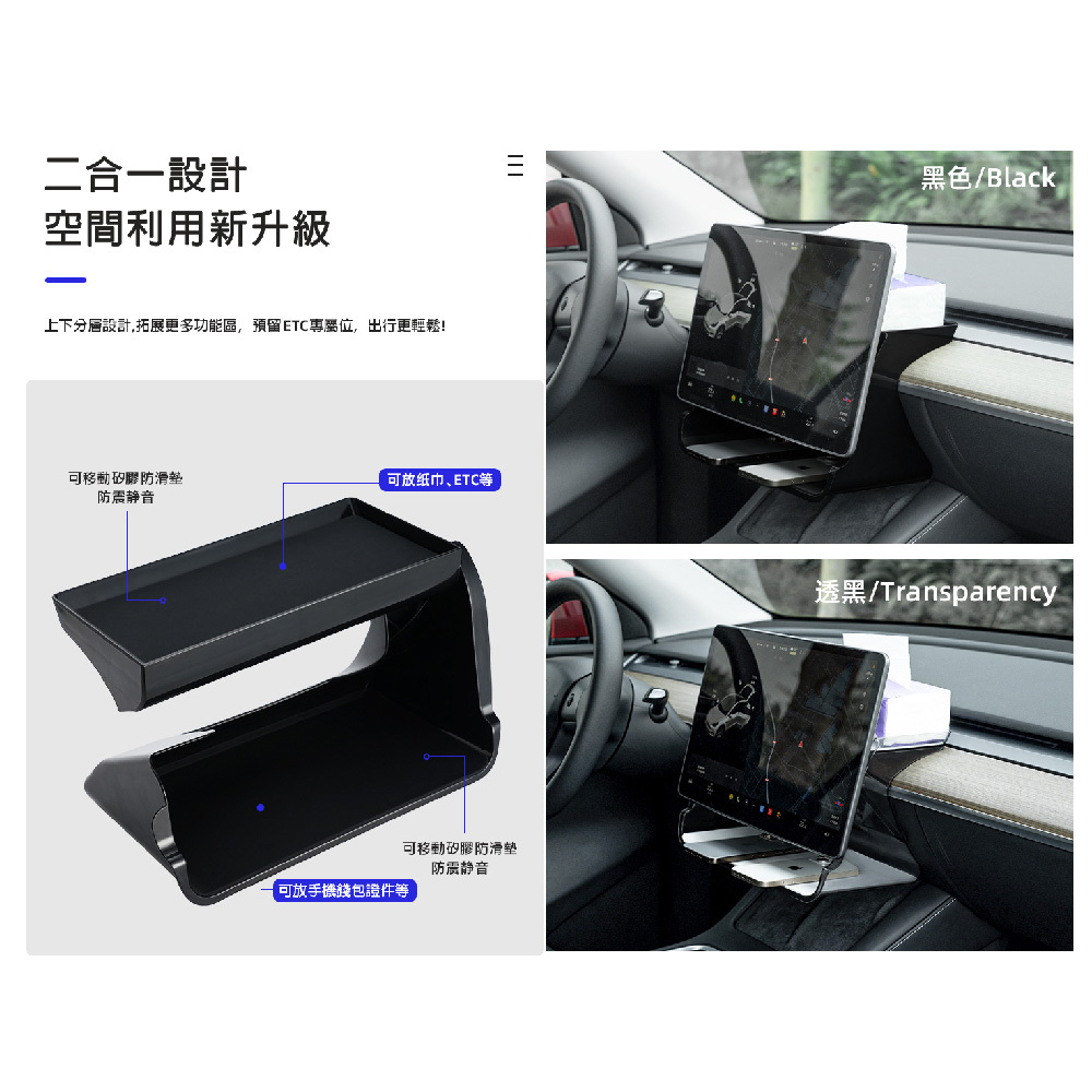 二合一中控螢幕儲物盒,專為 Tesla Model 3/Y 設計,原車開模貼合中控螢幕,穩固不掉落。壓克力與矽膠材質結合,防滑耐用,減震防刮,讓物品擺放更安全。增設額外收納空間,可放置手機、錢包、卡片等日常小物,提升車內整潔度。簡易安裝,無損車體結構,黑色、白色、透黑三種顏色可選,兼具時尚與實用性,完美提升車內收納與便利性。