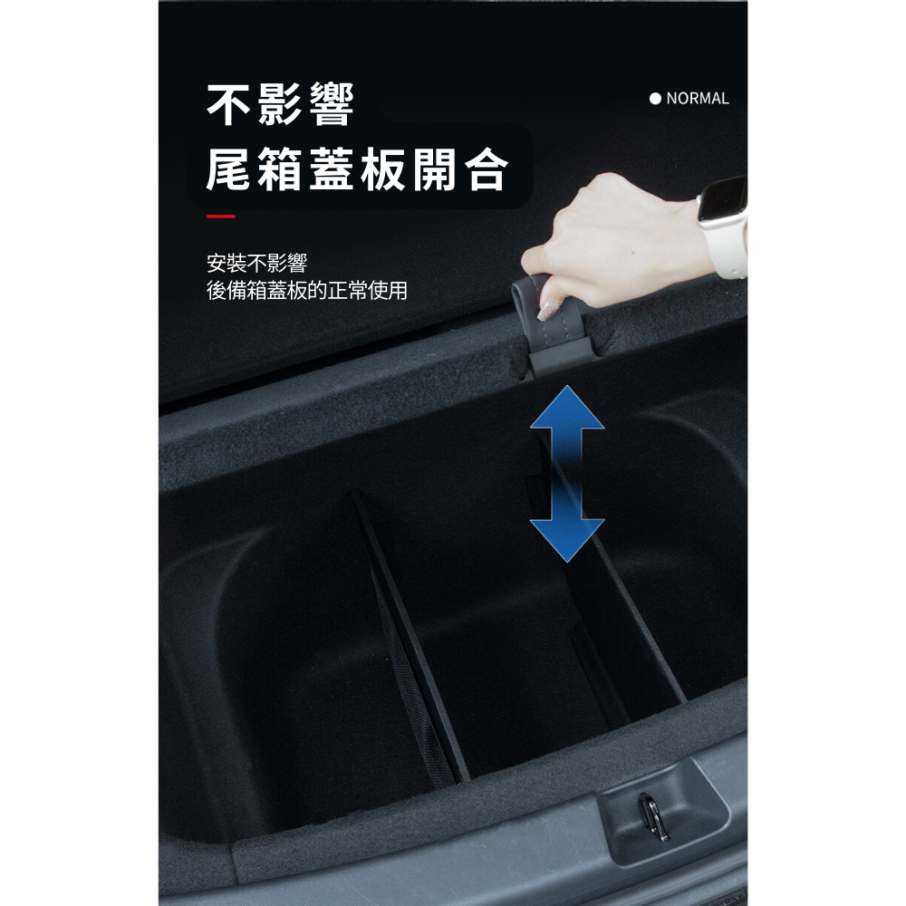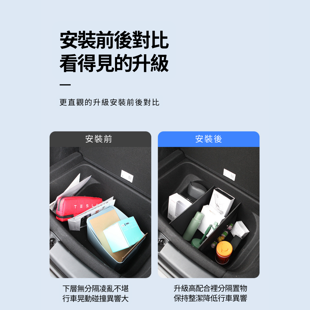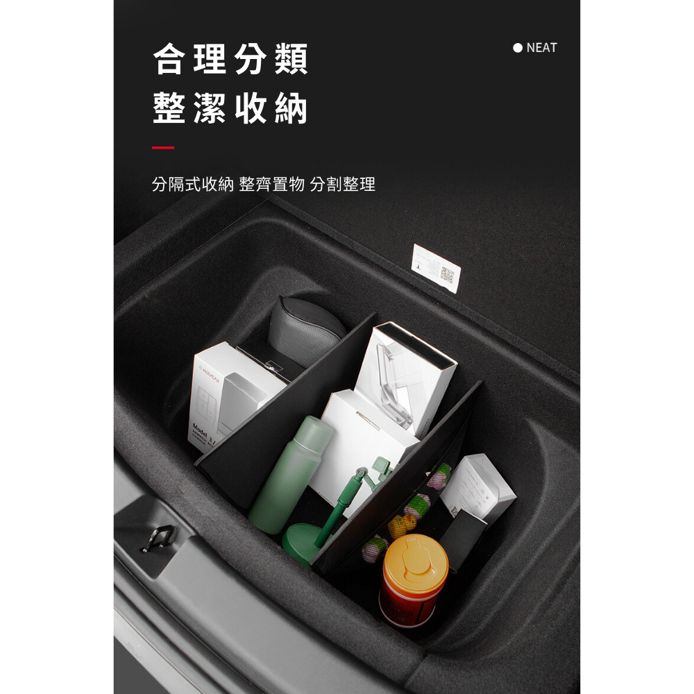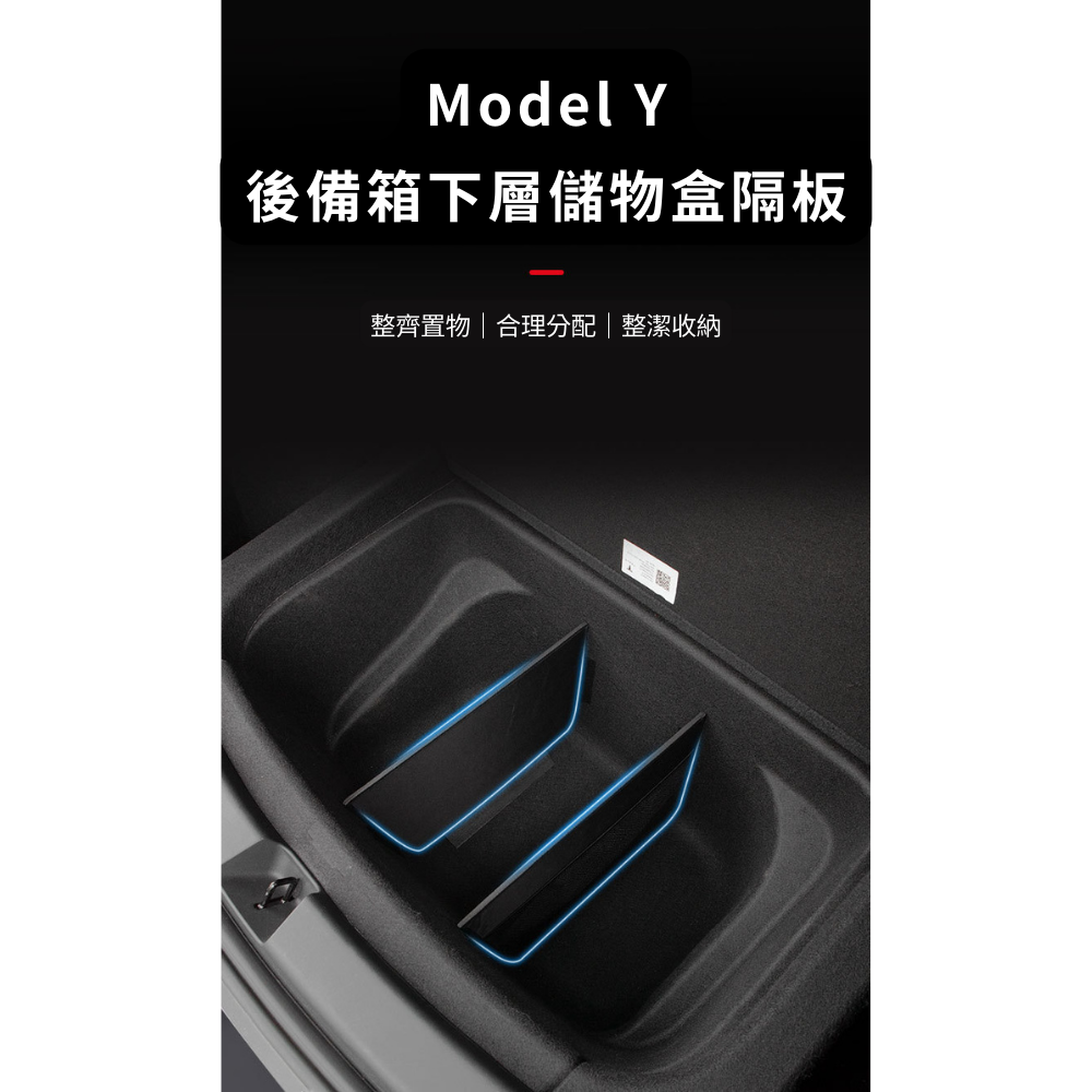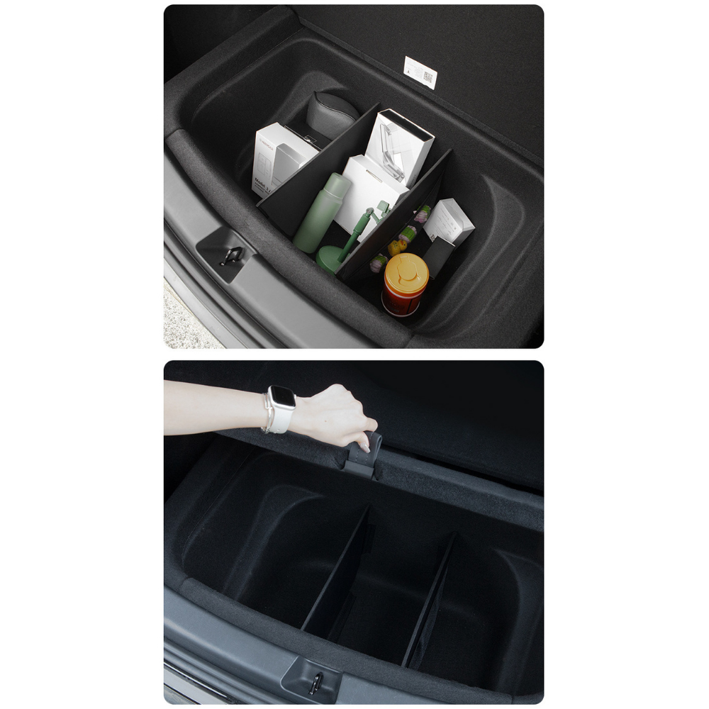 後車箱儲物盒分隔板,專為Tesla Model Y設計,實車開模,完美貼合後車箱,提供高效分隔收納功能。可靈活調整擺放方式,讓物品分類整齊,避免行駛中物品滑動碰撞。採用耐用材質,防刮耐磨,不易變形,確保長久使用。無損安裝,穩固不晃動,不影響尾箱蓋板開合,讓您的後車箱空間更實用、更有條理,是Tesla車主提升儲物效率的必備配件。