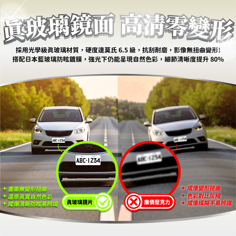 真玻璃材質實現 業界最大曲率 廣角設計,視野範圍較傳統鏡面擴大 2 倍,且邊緣無魚眼變形,左右車道與後方來車一覽無遺。