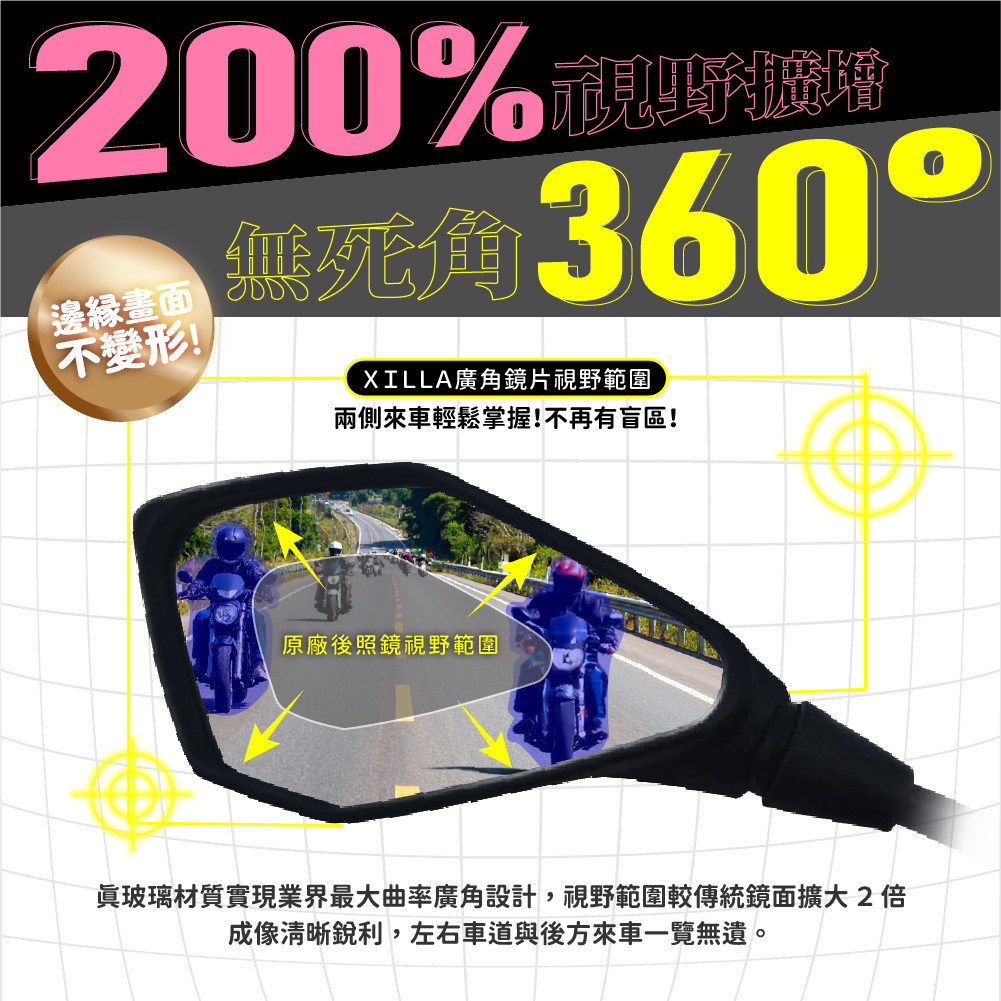 ●鏡片主要以凸面廣角來增大視野範圍,同時也會使鏡中的物體看起來比原本的更小,安裝後可能需重新適應後方來車的距離,初期請小心騎乘以避免交通事故。