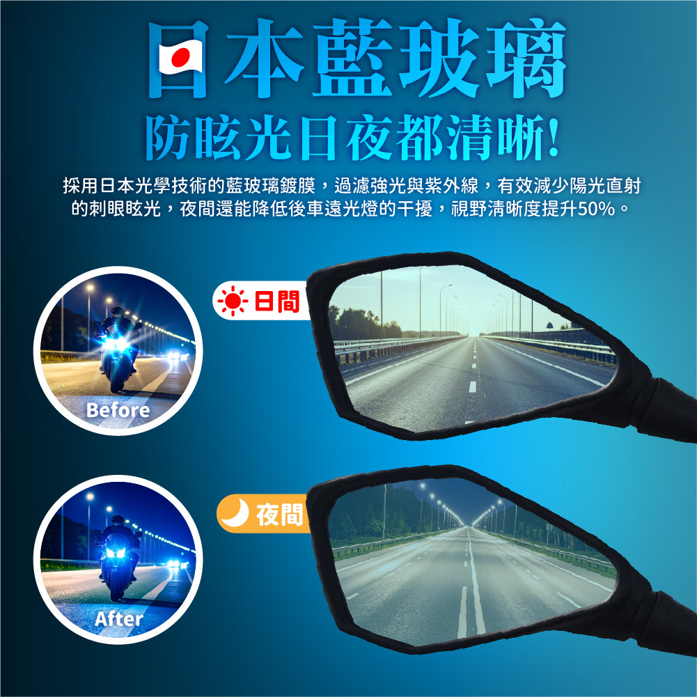 採用日本光學技術的藍玻璃鍍膜,過濾強光與紫外線,有效減少陽光直射的刺眼眩光,夜間還能降低後車遠光燈的干擾,視野清晰度提升50%。