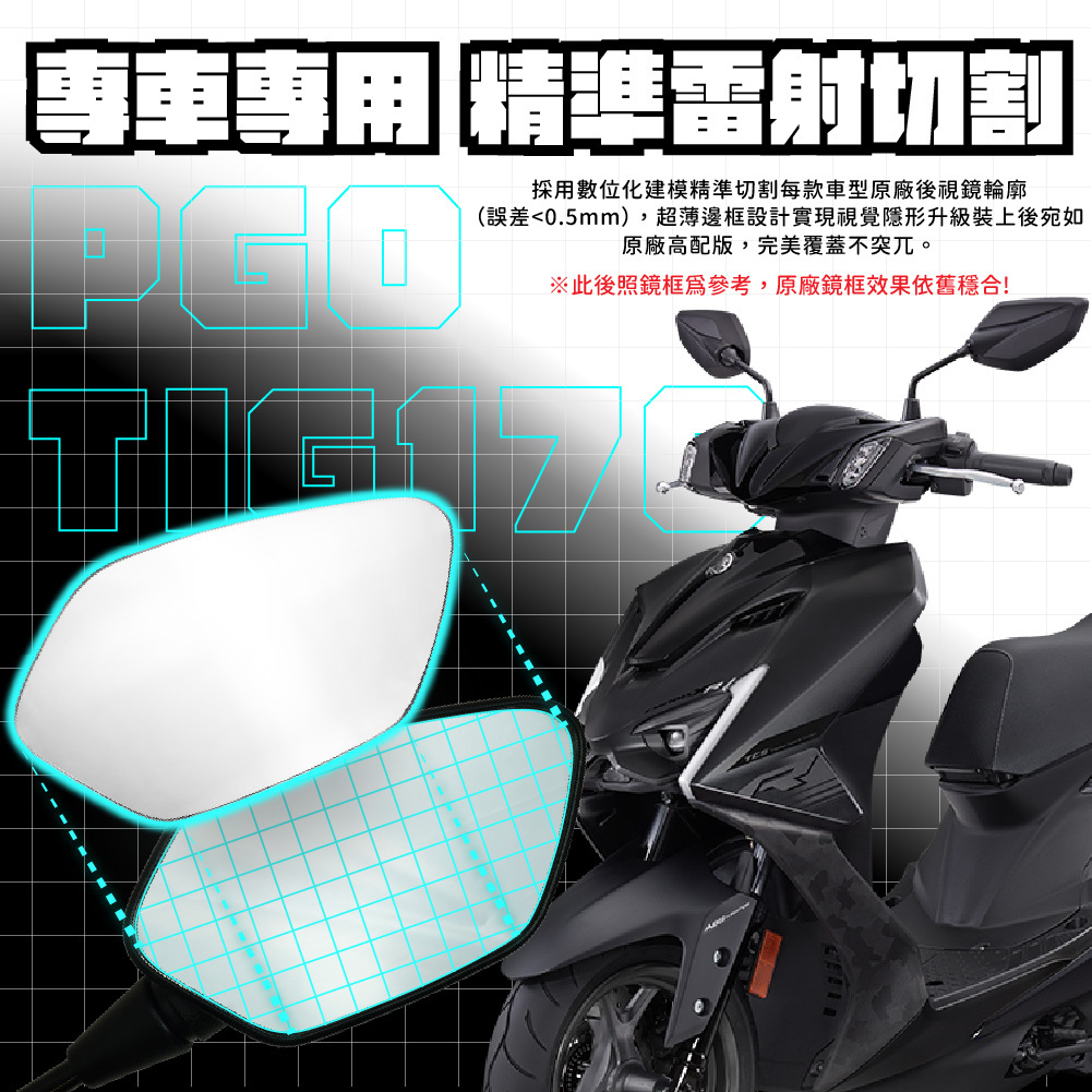 PGO 新款 TIG 170|超視野廣角後照鏡是為 **PGO TIG 170** 車款量身打造的安全升級配件,採 **廣角曲面鏡片設計**,能大幅擴展後方視野、減少視野盲區,讓變道、超車與轉彎判斷更清晰安心。鏡面具備 **防眩光處理**,在強光或夜間燈光照射下有效降低刺眼反光,提高觀察舒適度與安全性。安裝簡單、外型貼合原廠後照鏡造型,不破壞整體外觀,是提升行車視野與安全性的理想選擇。