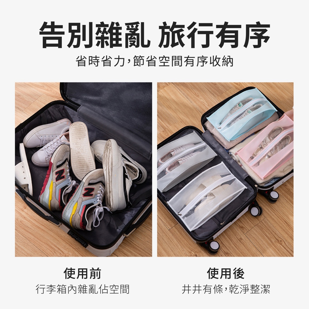 這款防潮防塵鞋子收納袋專為44碼以下鞋款設計,提供有效保護,防止灰塵與潮氣侵入。袋身採用耐用防水材質,具有隔塵效果,保持鞋子乾淨如新。透明視窗設計讓您輕鬆查看內容物,省時方便。攜帶設計輕巧,可折疊不佔空間,適合家庭、旅行及戶外活動使用,是您鞋子整理與收納的最佳選擇。