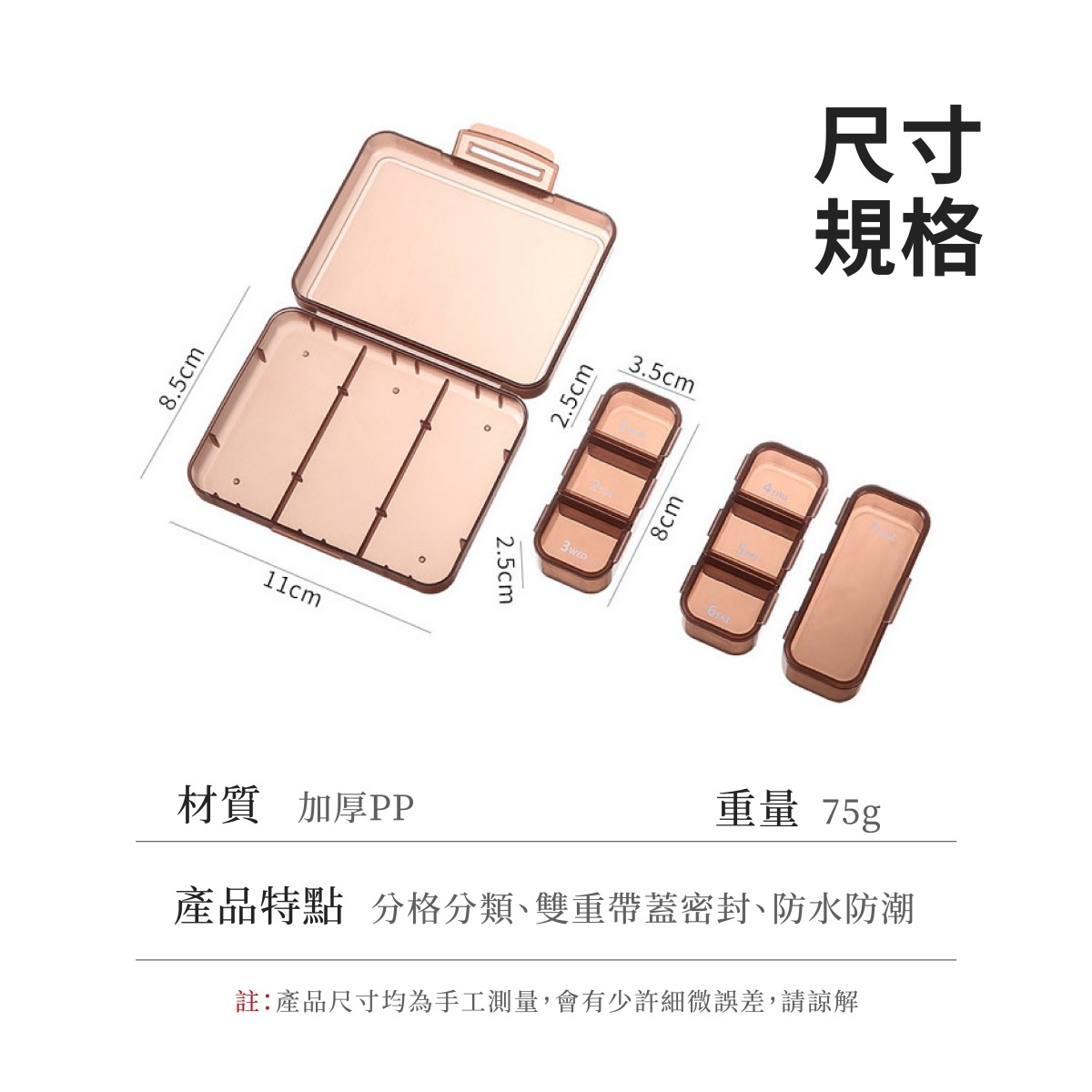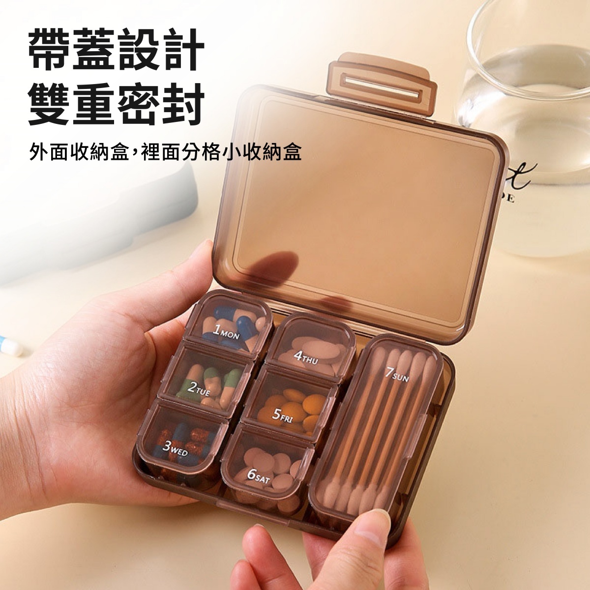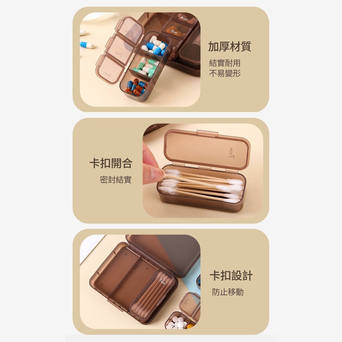 便攜一週7格藥盒,讓您每日用藥管理更有條理。外層收納盒搭配內部分格小藥盒,雙重密封保護設計,防止藥品受潮、灑落,更安心好攜帶。加厚PP材質結構穩固,不易變形,耐用又環保。透明可視盒身設計搭配清晰標示的每日天數,輕鬆辨識每格藥品,提升用藥效率與準確性。整體尺寸為 11×8.5×2.8cm,適合隨身攜帶、旅行或日常使用,幫助您從容掌握每一天的健康計畫。