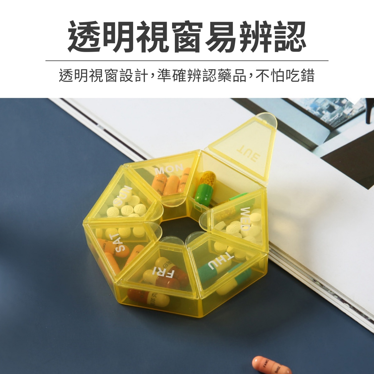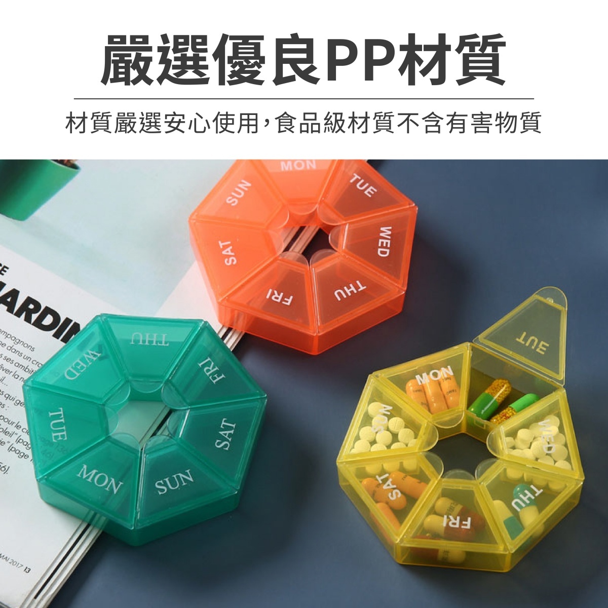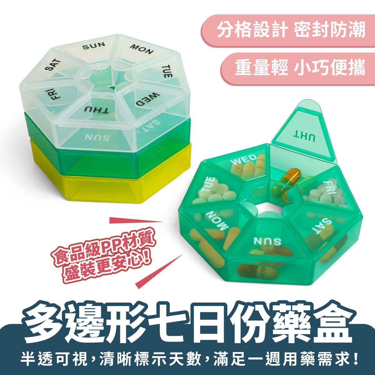 多邊形七日份藥盒,專為一週藥品管理設計,採用七格分裝,每格對應一天,搭配清晰天數標示,方便每日識別藥量,減少漏服機率。外殼為半透明設計,內部藥品一目瞭然,不需開蓋也能確認。材質選用食品級PP,更加安全無毒,適合長期使用。藥格間隔良好,不易串味,且好開好拿,長輩也能輕鬆使用。整體設計小巧輕薄,外出攜帶毫無負擔,是每日藥物管理與保健品收納的理想選擇。