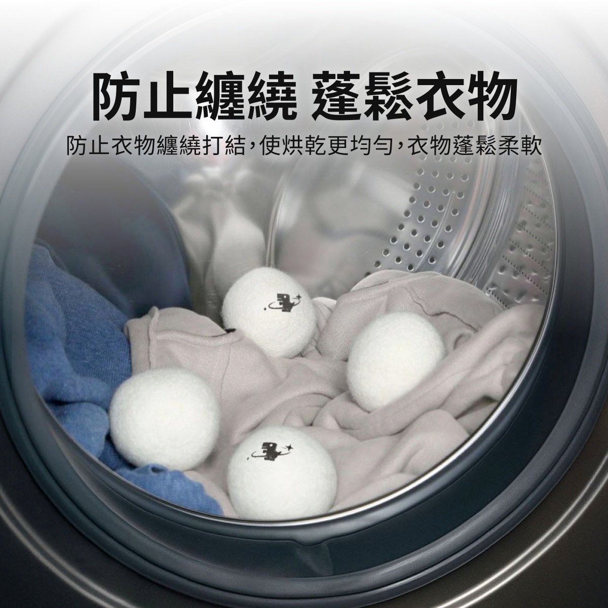 2.根據衣物量加入適當數量的烘衣球即可。使用後,請將烘衣球取出並保持乾燥後收納。