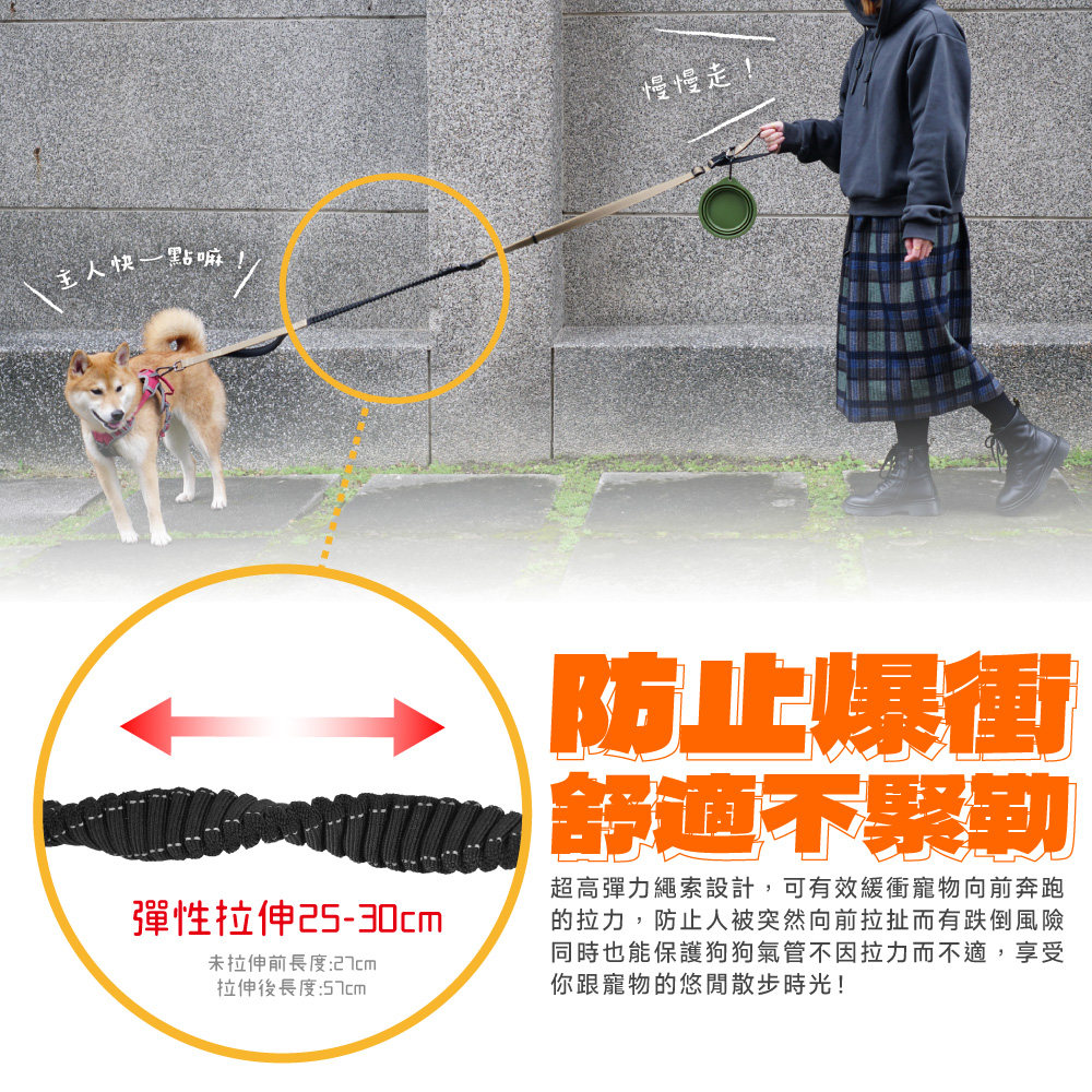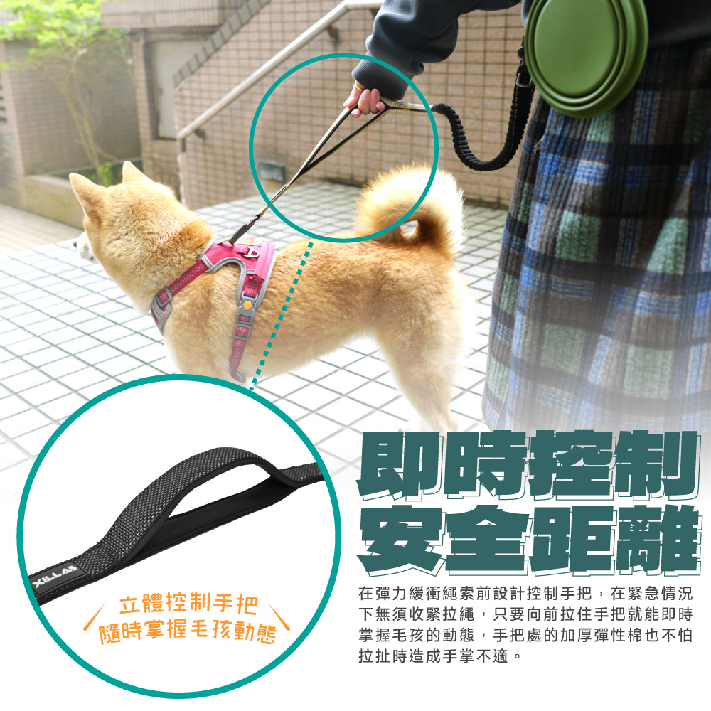 🔹 減震緩衝繩設計 – 吸收狗狗突發拉扯力道,保護您與愛犬
