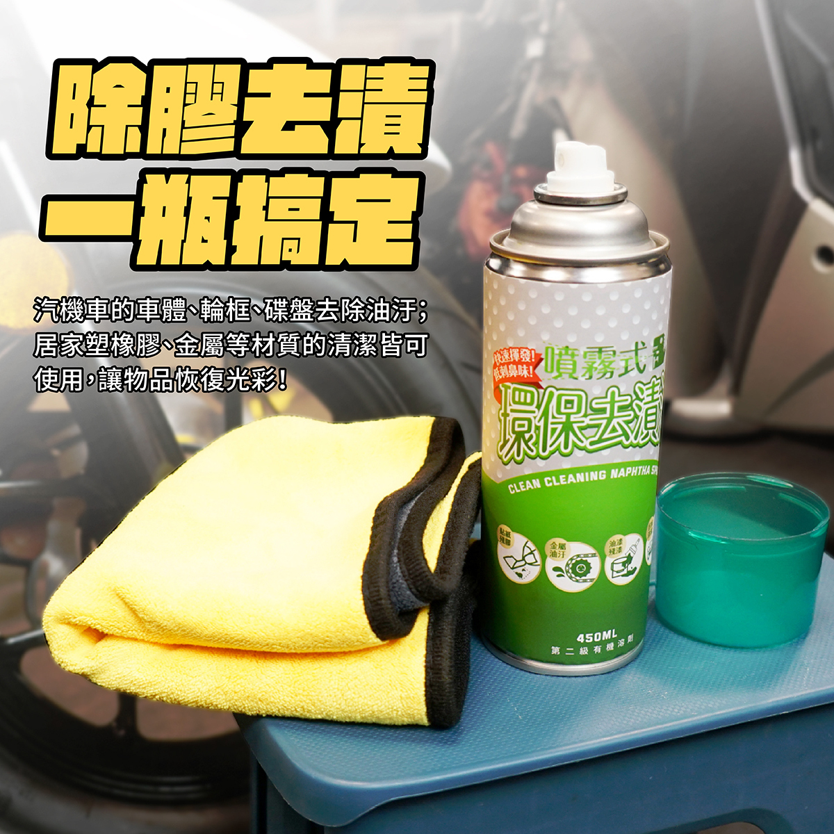 請先將去漬油噴灑於抹布或洗車巾上,在不明顯處進行試擦,確認不傷害該材質後,再擦拭清潔該處。