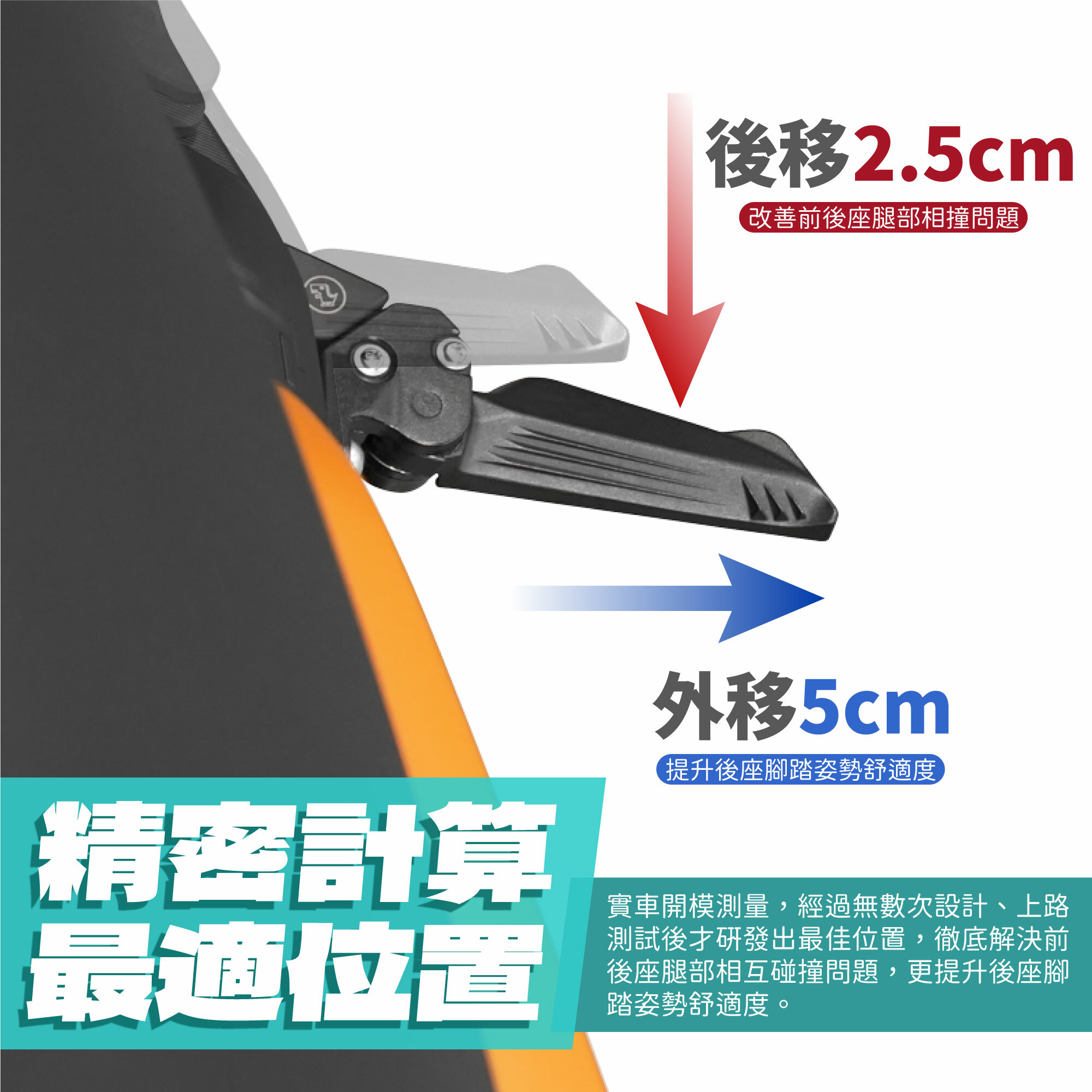 原廠飛旋踏板位置設計不佳,太靠近前座,以致前座腳下放時會與後座腳部碰撞~