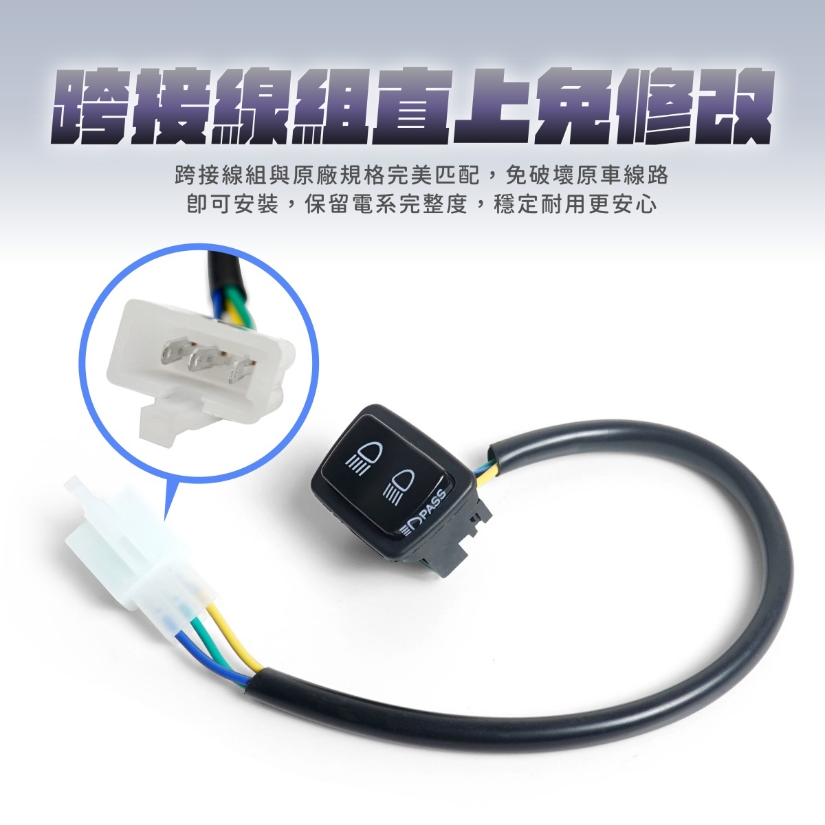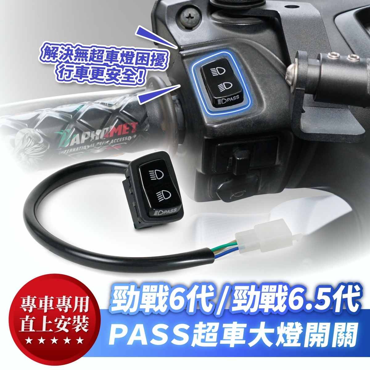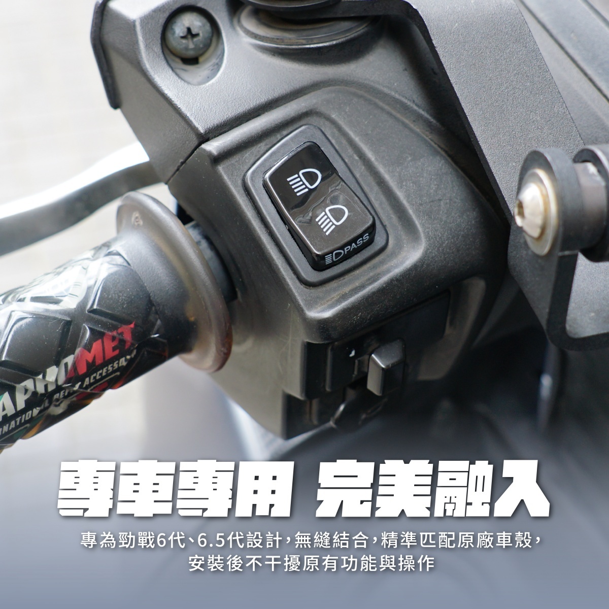 勁戰6、勁戰6.5代 PASS超車大燈開關,專為原廠規格精準開模,完美貼合不突兀。補足原廠未配備的 PASS 超車燈功能,能透過閃燈快速提醒,讓行車安全更有保障。跨接線組設計,直上免修改,不需破壞線路,即可輕鬆安裝,保持車體完整度。開關按鍵設計手感清晰,上壓與下壓都能感受到乾脆回饋,不會卡鍵,操作更安心。是勁戰車友升級安全照明的最佳改裝選擇
