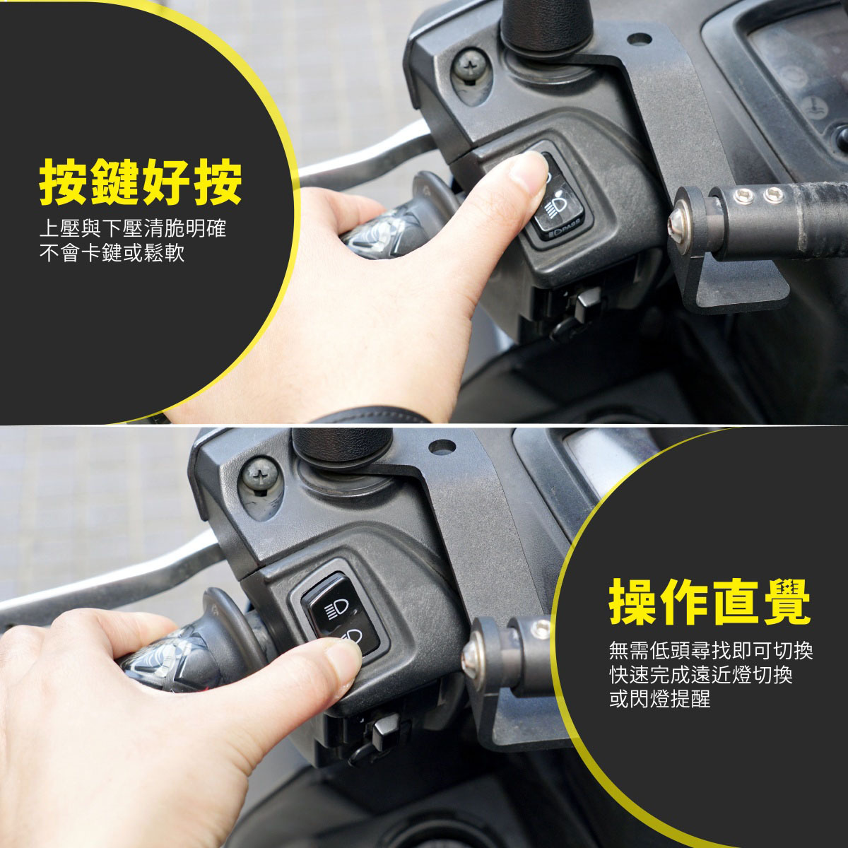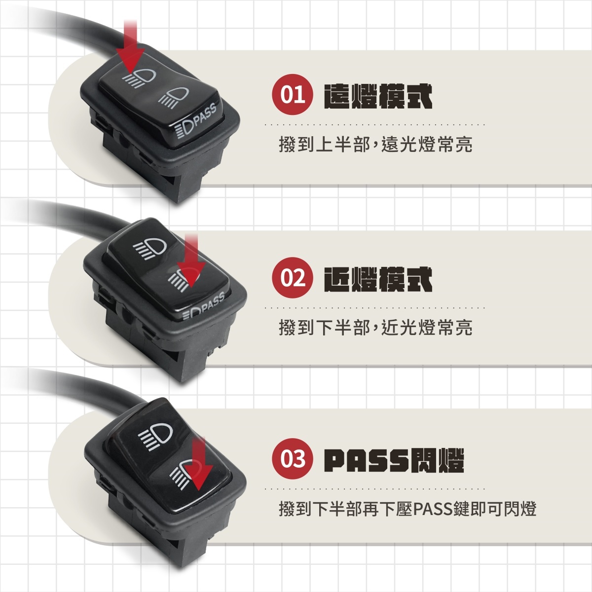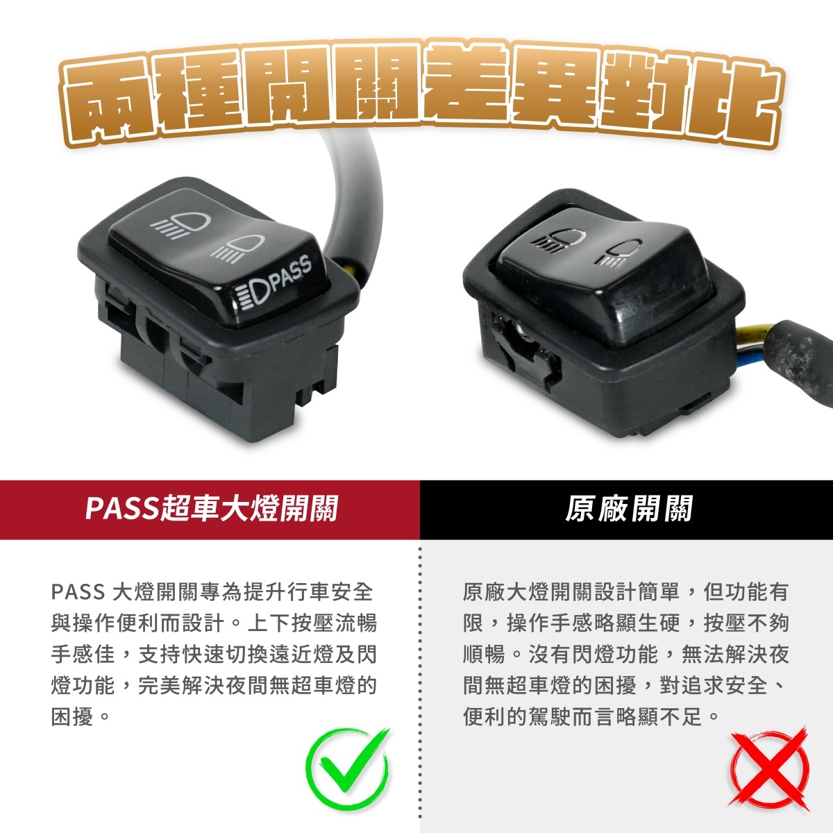 勁戰6、勁戰6.5代 PASS超車大燈開關,專為原廠規格精準開模,完美貼合不突兀。補足原廠未配備的 PASS 超車燈功能,能透過閃燈快速提醒,讓行車安全更有保障。跨接線組設計,直上免修改,不需破壞線路,即可輕鬆安裝,保持車體完整度。開關按鍵設計手感清晰,上壓與下壓都能感受到乾脆回饋,不會卡鍵,操作更安心。是勁戰車友升級安全照明的最佳改裝選擇