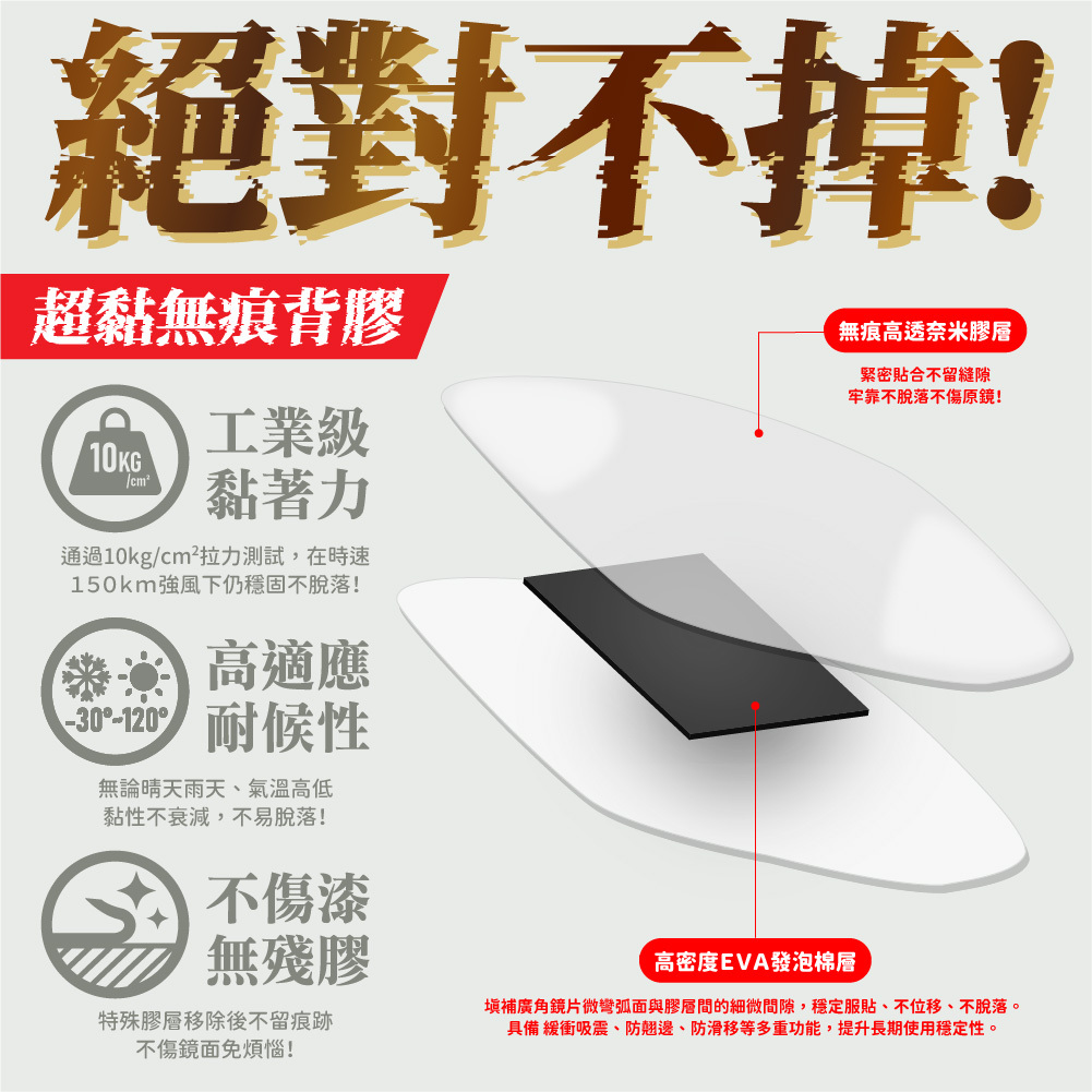 ●鏡片皆以原廠後照鏡尺寸開發,專車專用,若您有改裝後照鏡會無法安裝,購買/撕除背膠黏貼前請確認形狀是否一致。