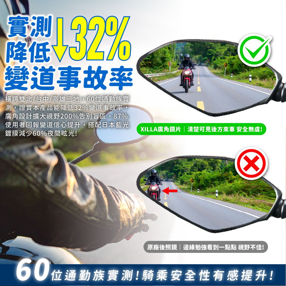 橫跨雙北/台中/高雄三地,60位通勤族實測,證實本產品能降低32%變道事故率,廣角設計擴大視野200%告別盲區,87%使用者回報變道信心提升,搭配日本藍光鍍膜減少60%夜間眩光