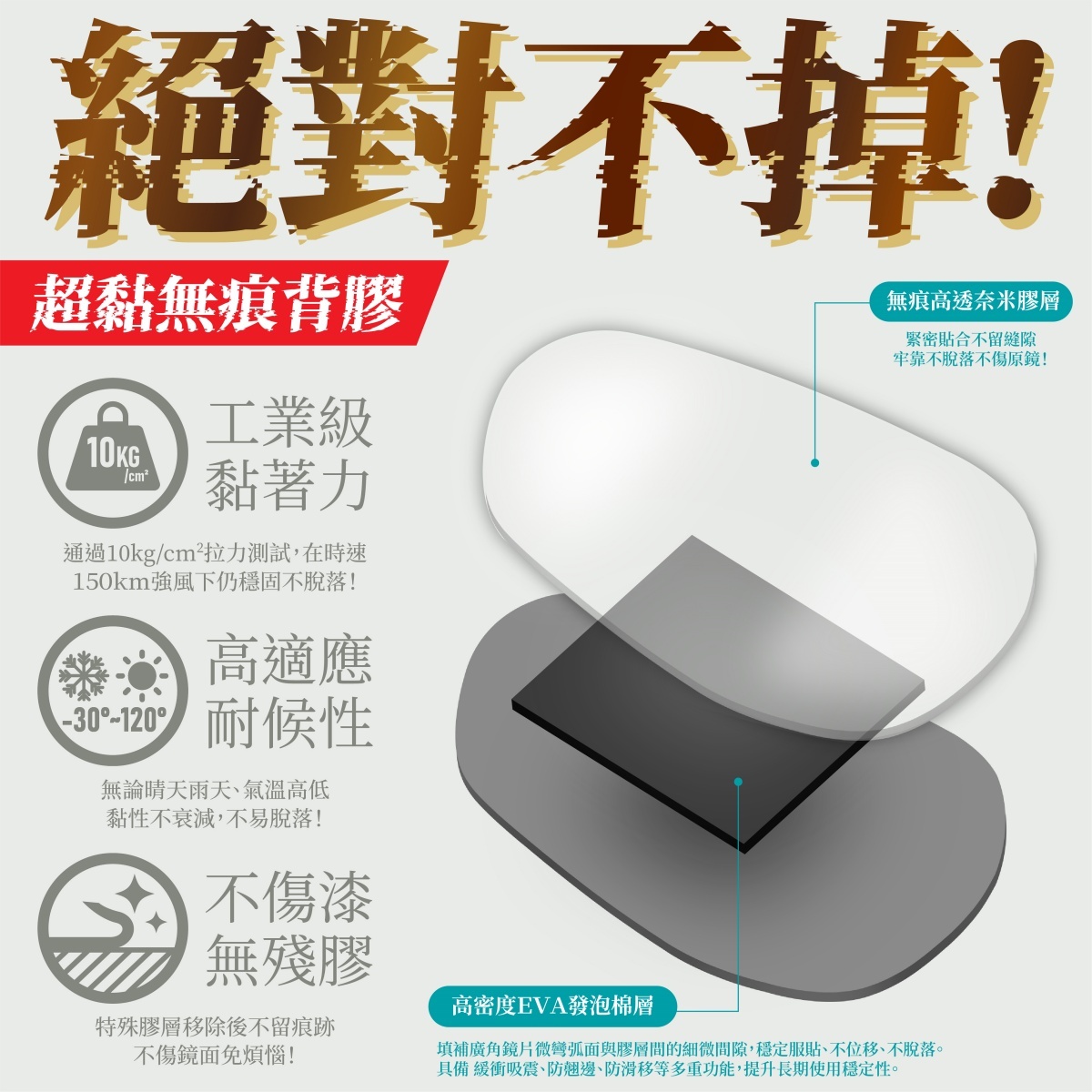 ●鏡片皆以原廠後照鏡尺寸開發,專車專用,若您有改裝後照鏡會無法安裝,購買/撕除背膠黏貼前請確認形狀是否一致。