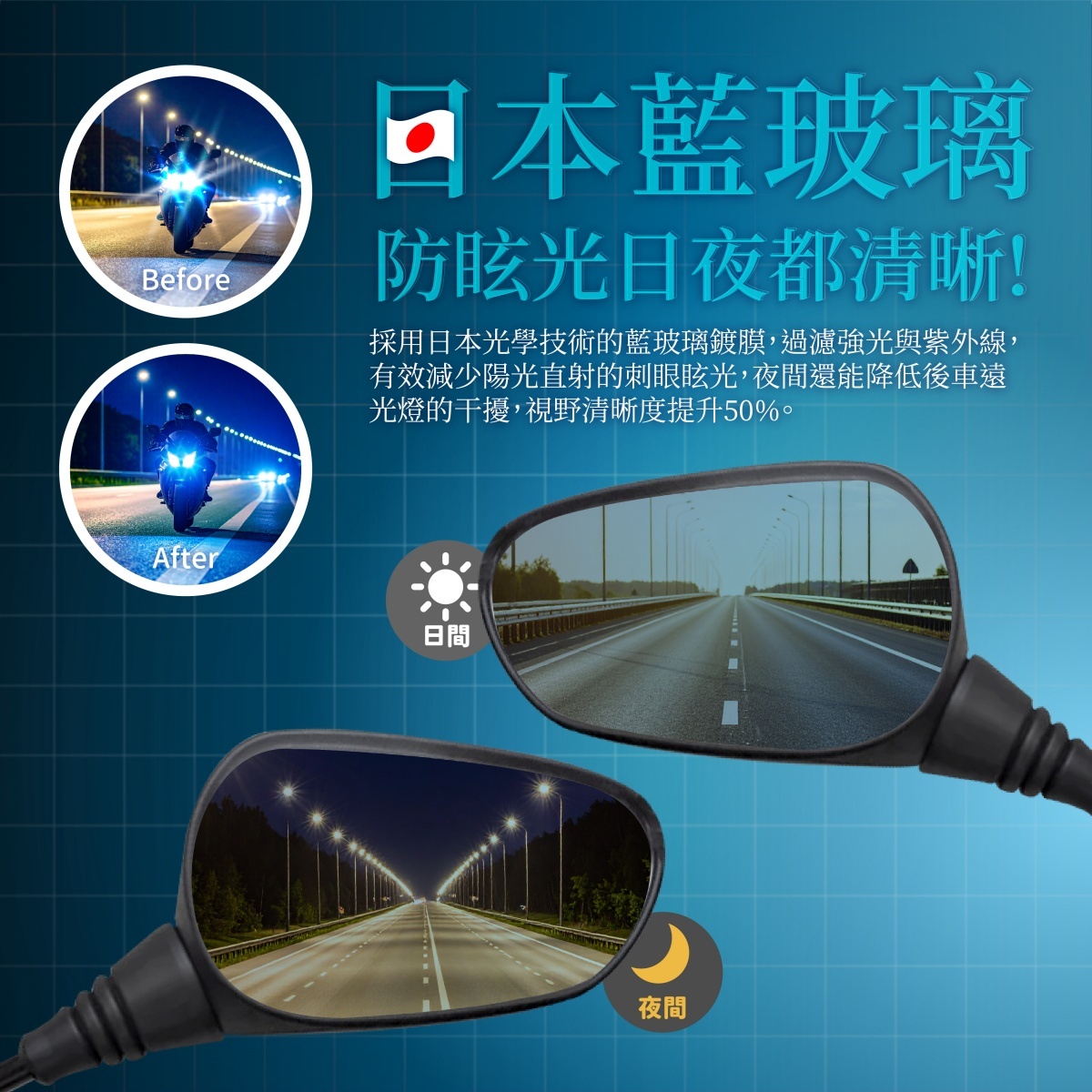 採用日本光學技術的藍玻璃鍍膜,過濾強光與紫外線,有效減少陽光直射的刺眼眩光,夜間還能降低後車遠光燈的干擾,視野清晰度提升50%。