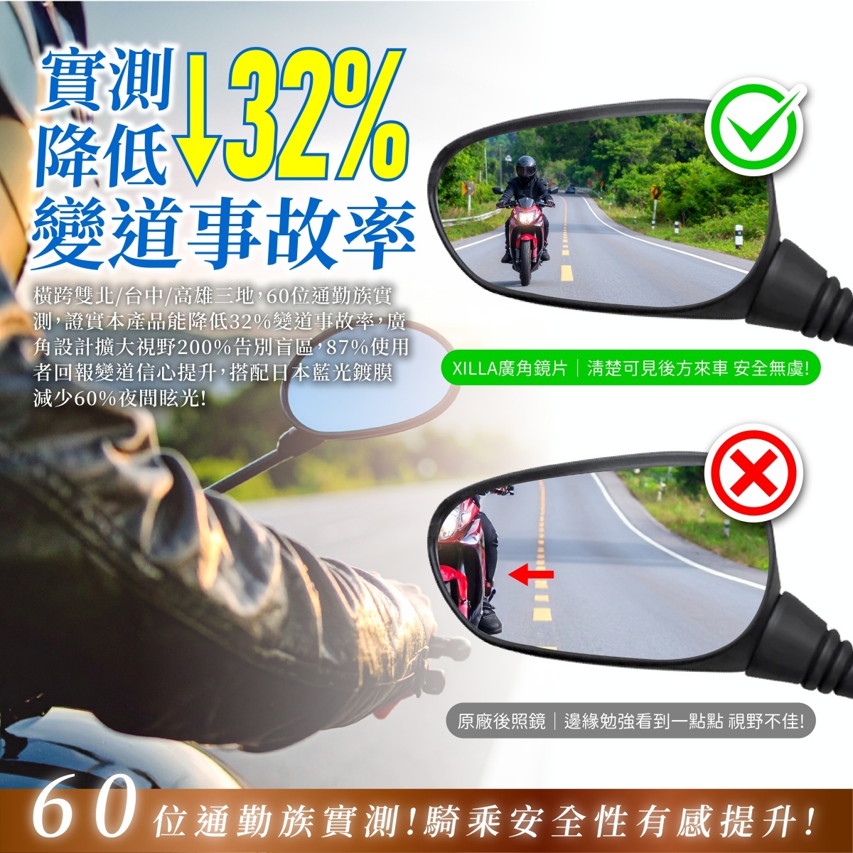 橫跨雙北/台中/高雄三地,60位通勤族實測,證實本產品能降低32%變道事故率,廣角設計擴大視野200%告別盲區,87%使用者回報變道信心提升,搭配日本藍光鍍膜減少60%夜間眩光