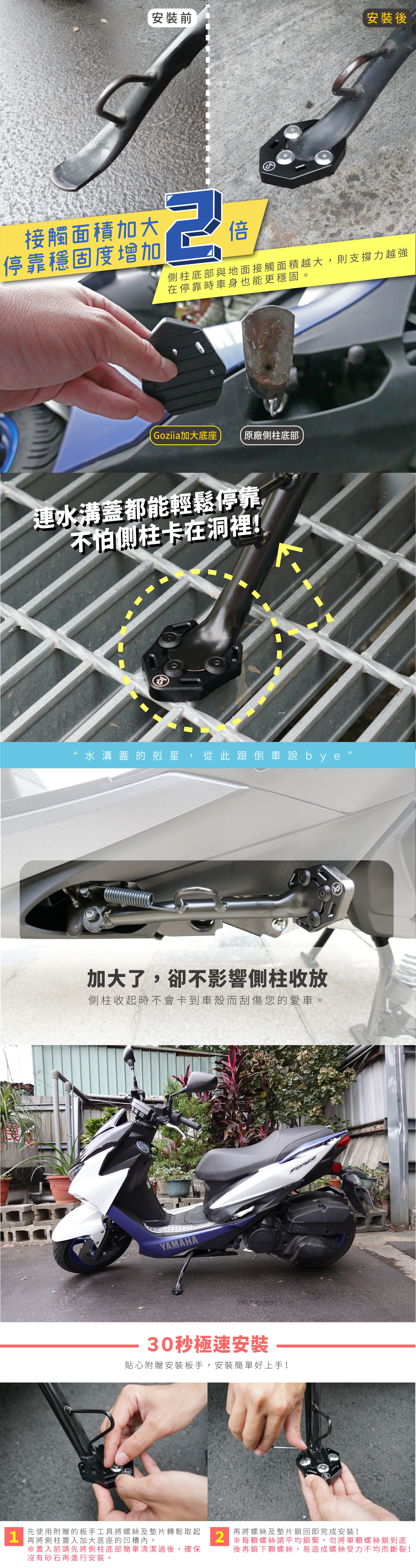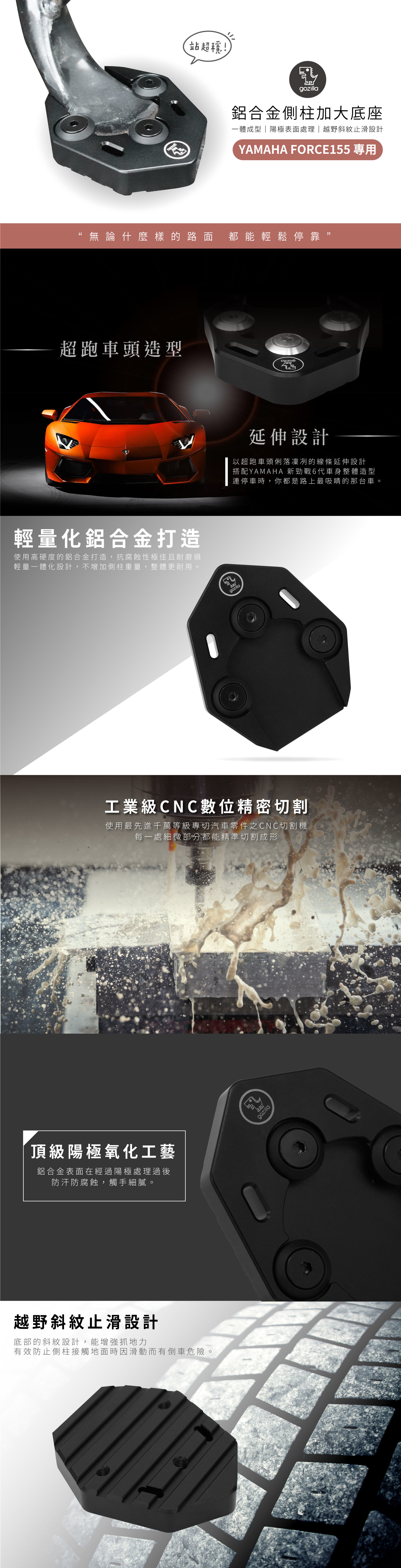 YAMAHA FORCE 155 鋁合金側柱加大底座,專為提升車輛穩定性與支撐力而設計。此加大底座採用高強度鋁合金材質,具有輕量化與耐用性,能有效增強車輛側柱的穩定性,防止側柱變形或損壞,提升整體車輛的使用壽命。加大設計可提供更好的支撐力,確保車主在日常駕駛及停車過程中更加安全穩定。安裝簡便,完美貼合YAMAHA FORCE 155,無需改裝即可輕鬆升級,讓車主在享受騎行的同時,也能提升車輛的耐用度與性能。