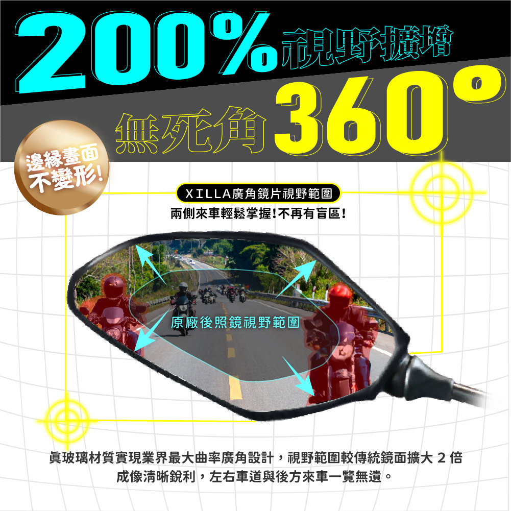 ●鏡片主要以凸面廣角來增大視野範圍,同時也會使鏡中的物體看起來比原本的更小,安裝後可能需重新適應後方來車的距離,初期請小心騎乘以避免交通事故。