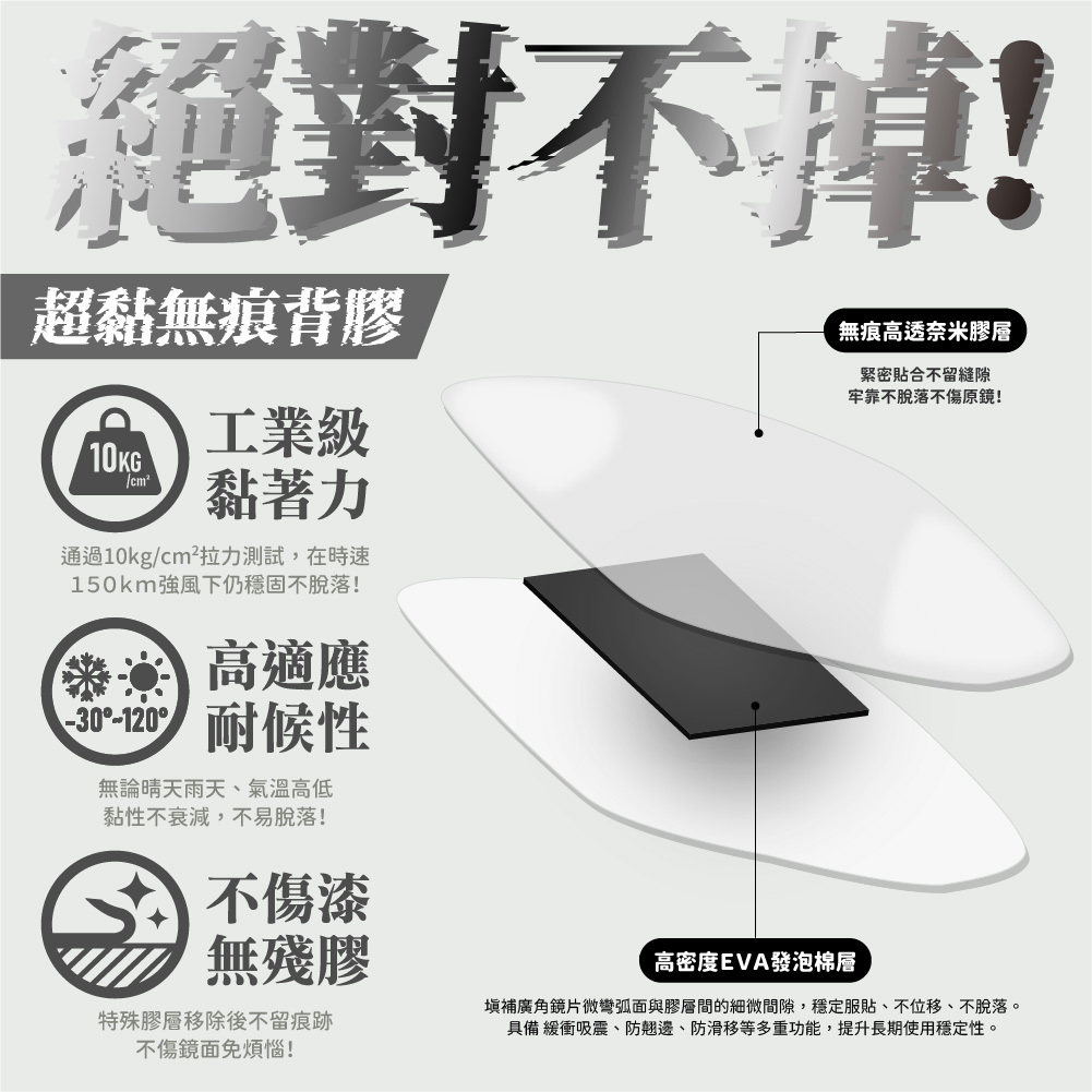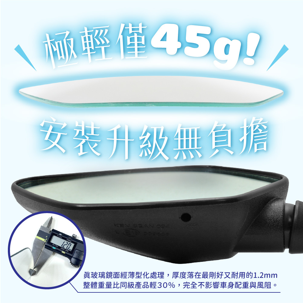 真玻璃鏡面經 薄型化處理(厚度 1.2mm),整體重量比同級產品輕 30%,完全不影響車身配重與風阻。
