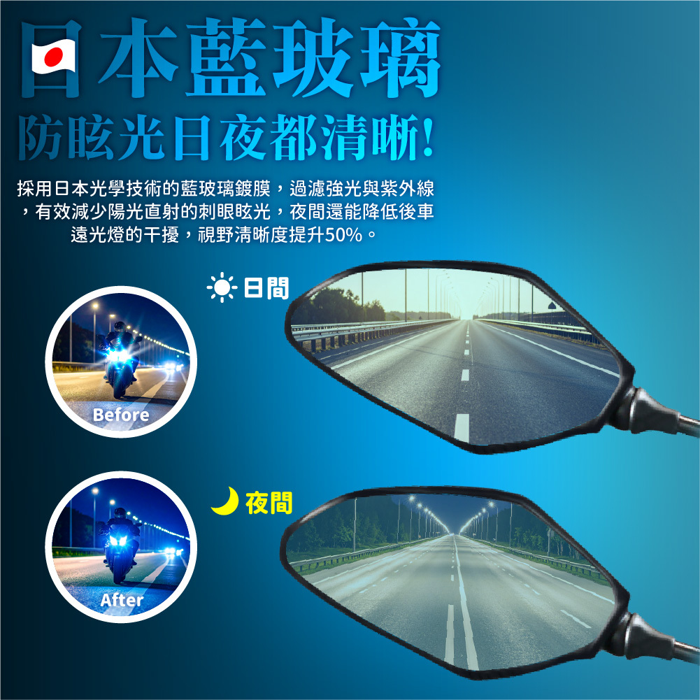採用日本光學技術的藍玻璃鍍膜,過濾強光與紫外線,有效減少陽光直射的刺眼眩光,夜間還能降低後車遠光燈的干擾,視野清晰度提升50%。