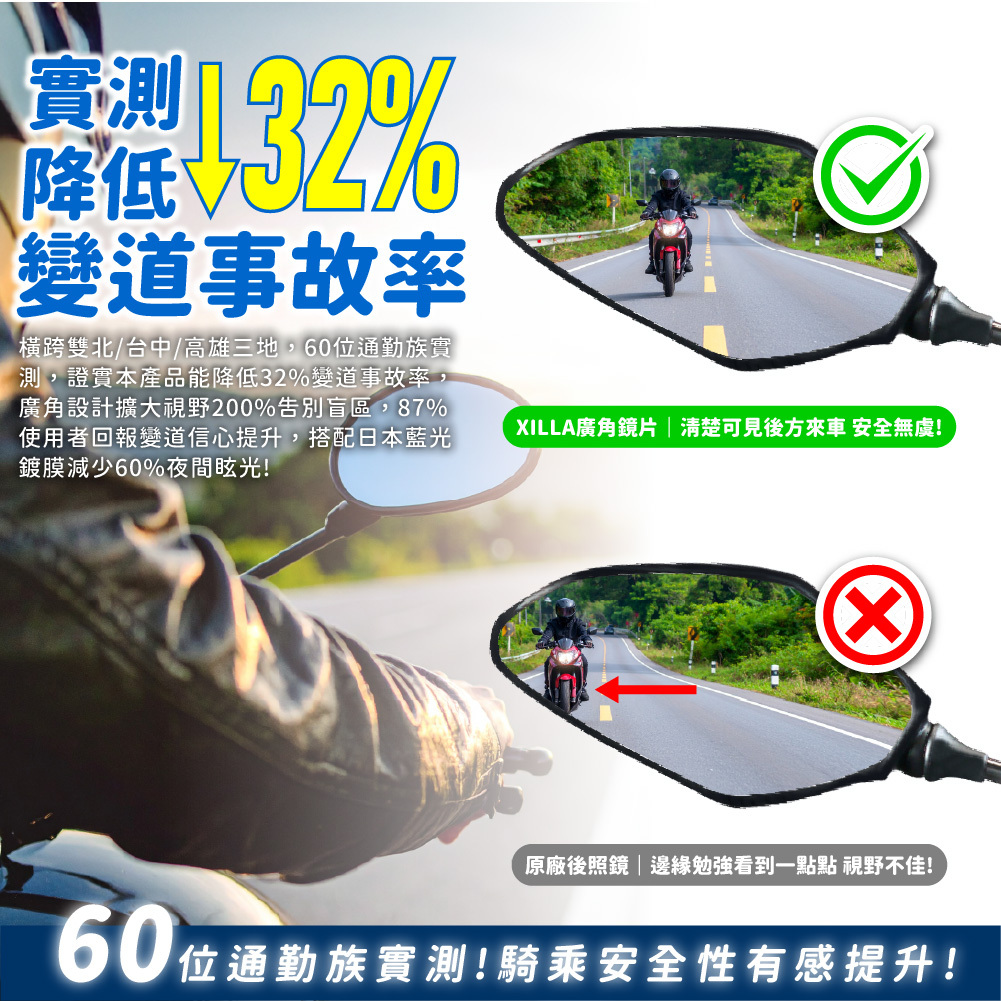 橫跨雙北/台中/高雄三地,60位通勤族實測,證實本產品能降低32%變道事故率,廣角設計擴大視野200%告別盲區,87%使用者回報變道信心提升,搭配日本藍光鍍膜減少60%夜間眩光