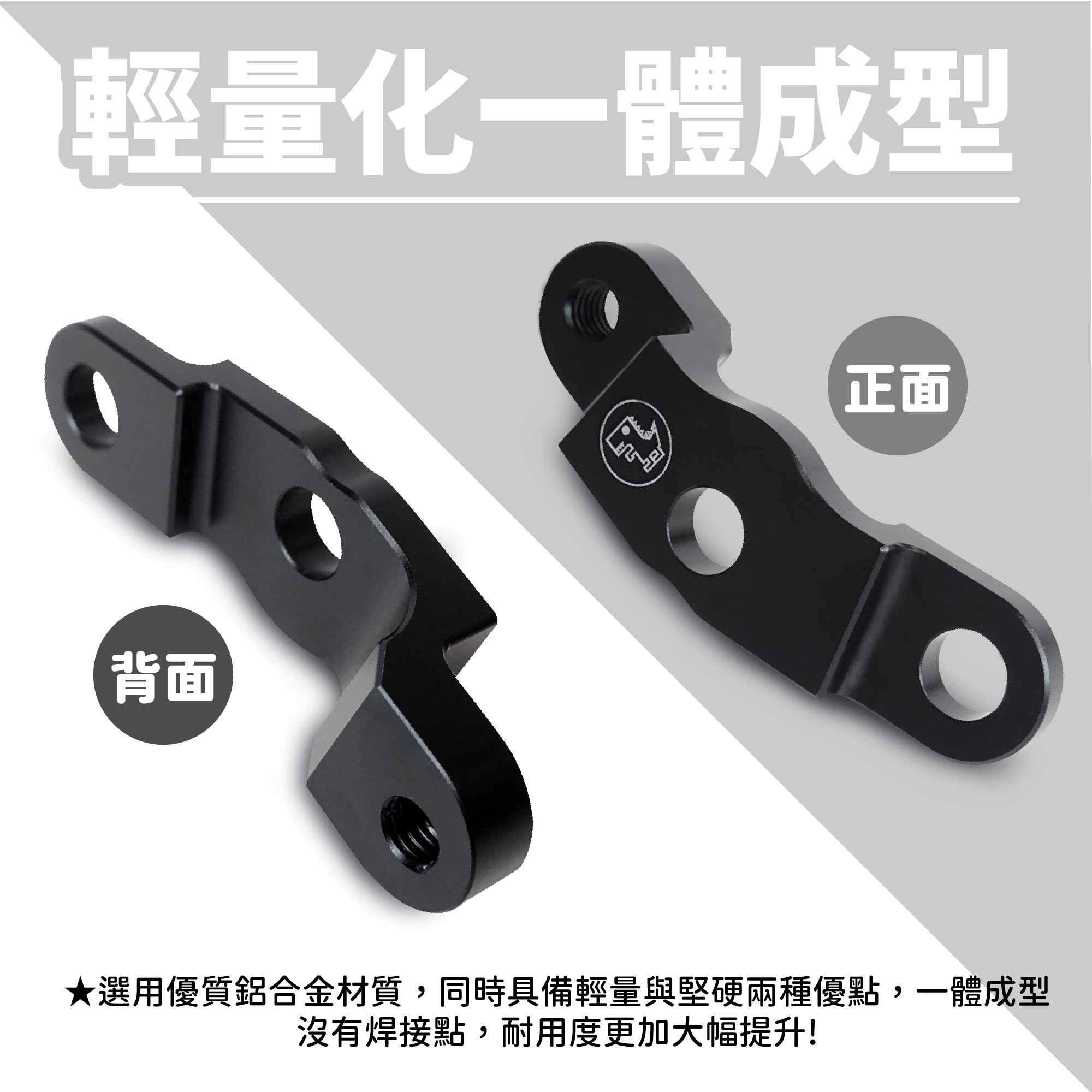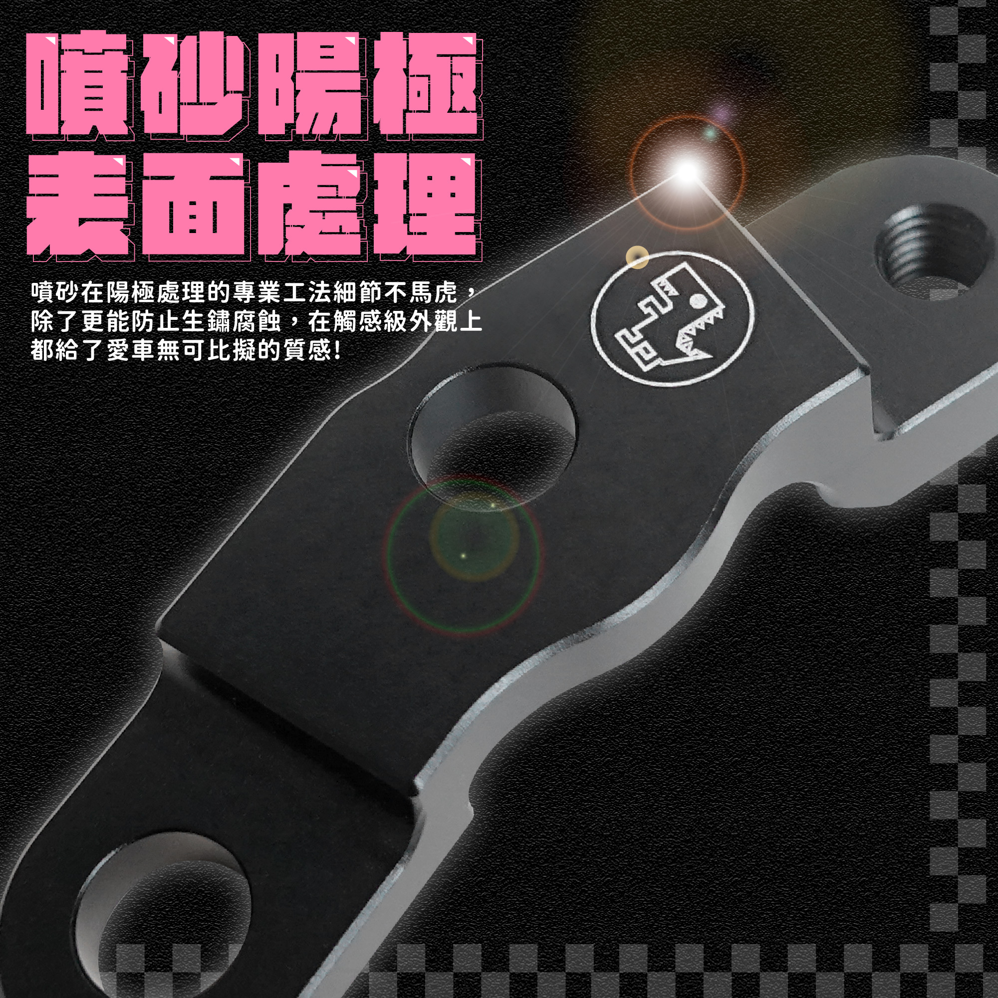專為勁戰七代車款打造,採用高強度鋁合金材質,具備輕量化與耐用性,能有效提升車尾整體質感。透過上移設計,讓原廠後土除位置更俐落,不僅美化外觀,也能改善原廠易被泥水噴濺的問題。表面經陽極氧化處理,防鏽耐蝕,質感細膩。原廠鎖點設計,安裝簡單免修改,DIY也能輕鬆完成。讓車身線條更流暢,運動感更強。此款轉接座兼具實用與美觀,是提升勁戰七代改裝細節的理想選擇。