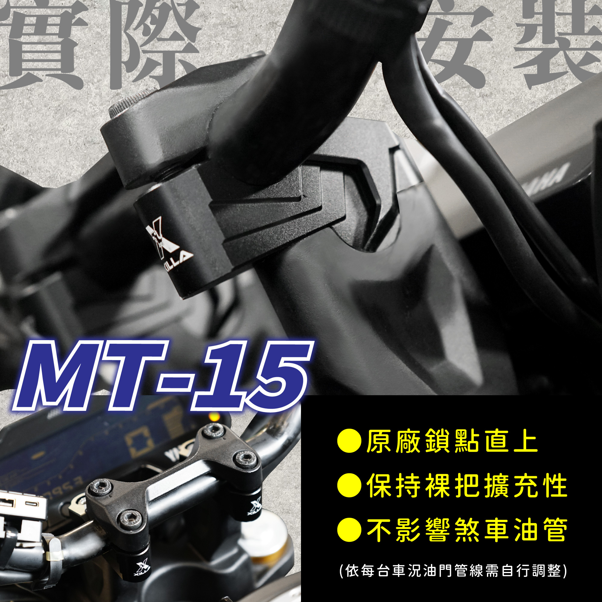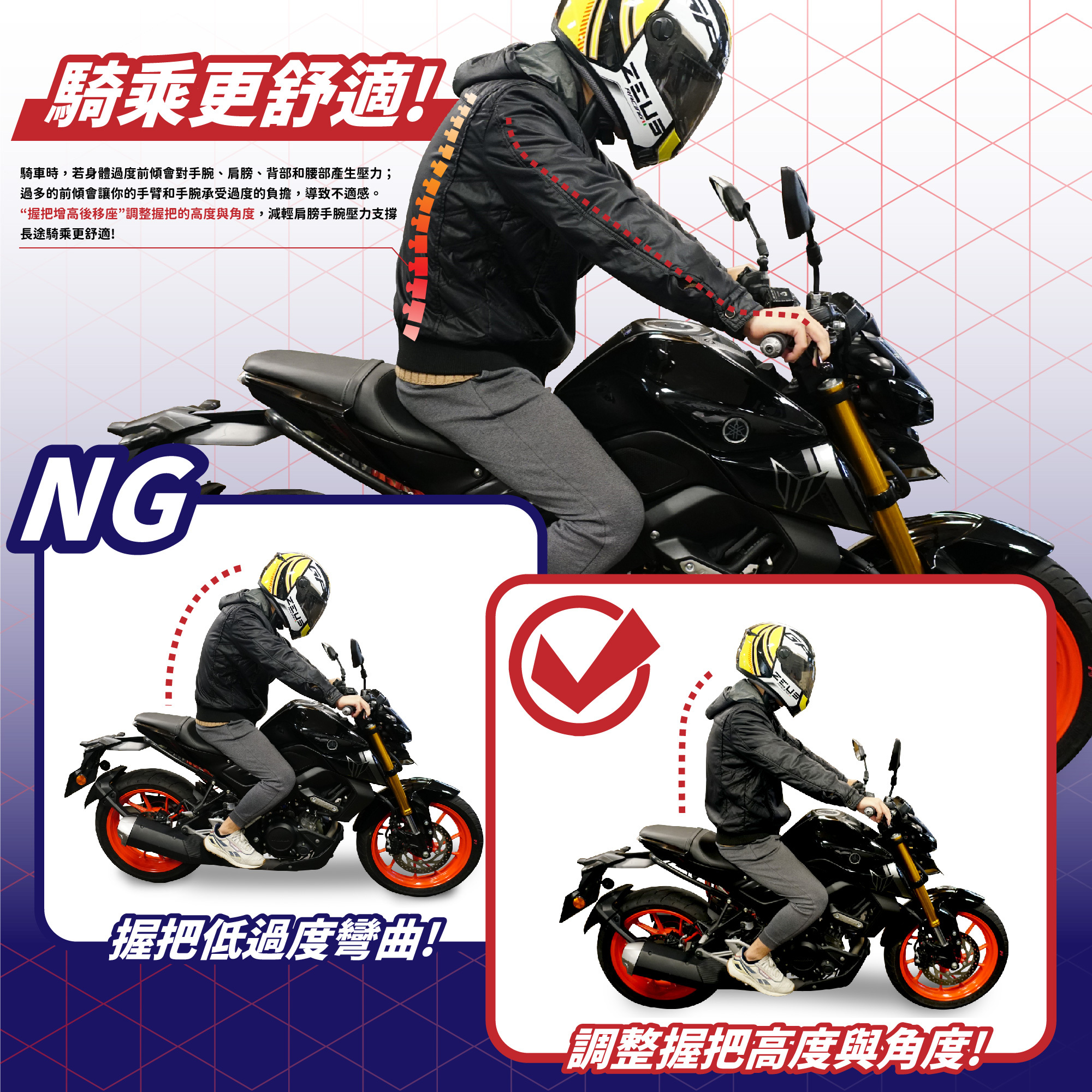 YAMAHA MT-15鋁合金握把增高後移座是一款專為YAMAHA MT-15設計的配件,旨在提升騎乘舒適度和操控性。這款握把增高後移座能夠讓握把位置稍微增高並向後移動,改善騎士的坐姿,使長時間騎行不容易感到疲勞,特別是對於高個子騎士來說,這樣的設計能減少壓迫感並提供更好的騎行角度。製作材質為鋁合金,具有輕量且堅固的特性,同時增強了整體的耐用性。這款增高後移座不僅提升了舒適性,還能改善騎行時的操控反應,為MT-15的車主帶來更優質的騎行體驗。