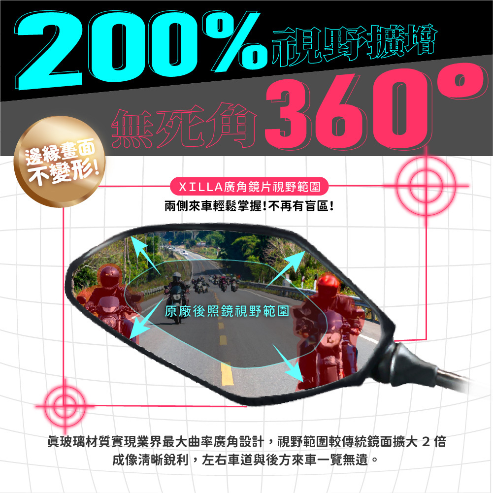 真玻璃材質實現 業界最大曲率 廣角設計,視野範圍較傳統鏡面擴大 2 倍,且邊緣無魚眼變形,左右車道與後方來車一覽無遺。