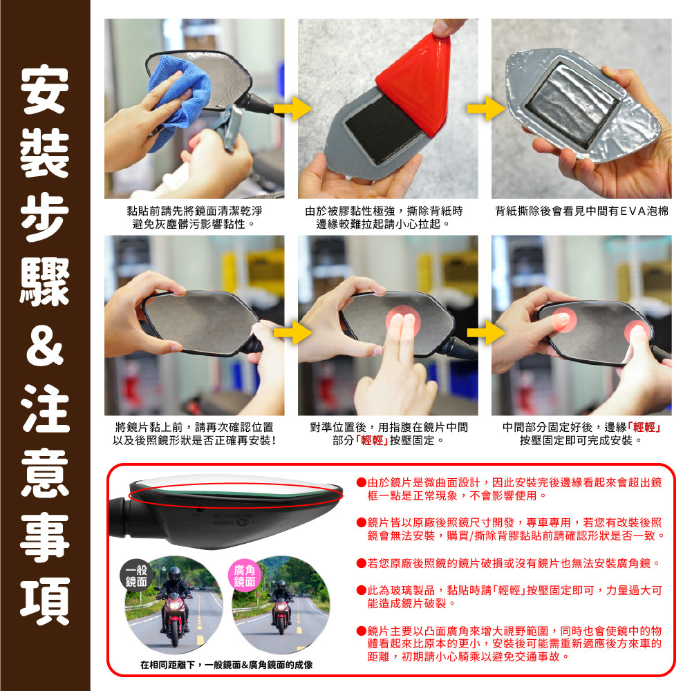 ●鏡片主要以凸面廣角來增大視野範圍,同時也會使鏡中的物體看起來比原本的更小,安裝後可能需重新適應後方來車的距離,初期請小心騎乘以避免交通事故。