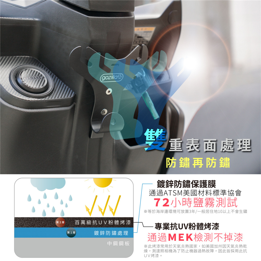 👍通過72小時美國材料標準協會制定鹽霧測試,(等同於機車停放在海岸邊3年不動也不會生鏽,一般居住地方10年以上)