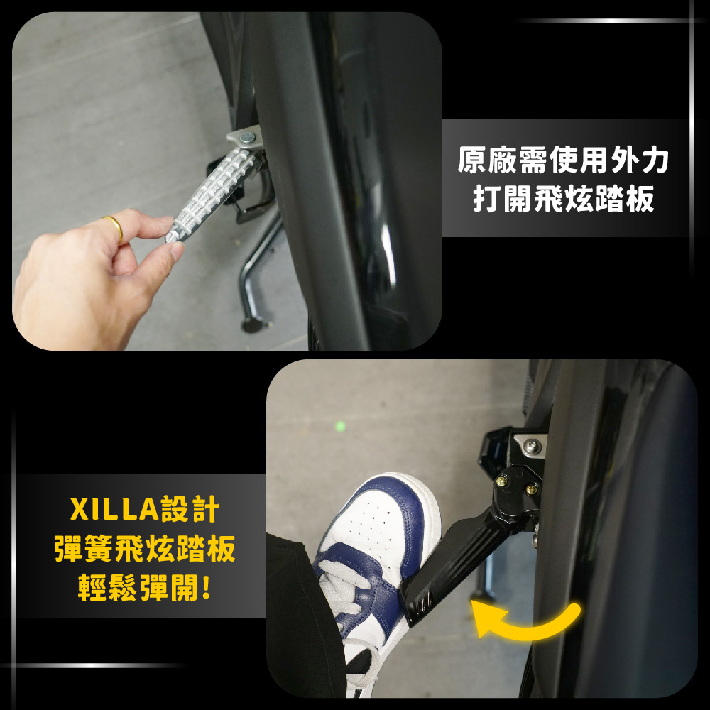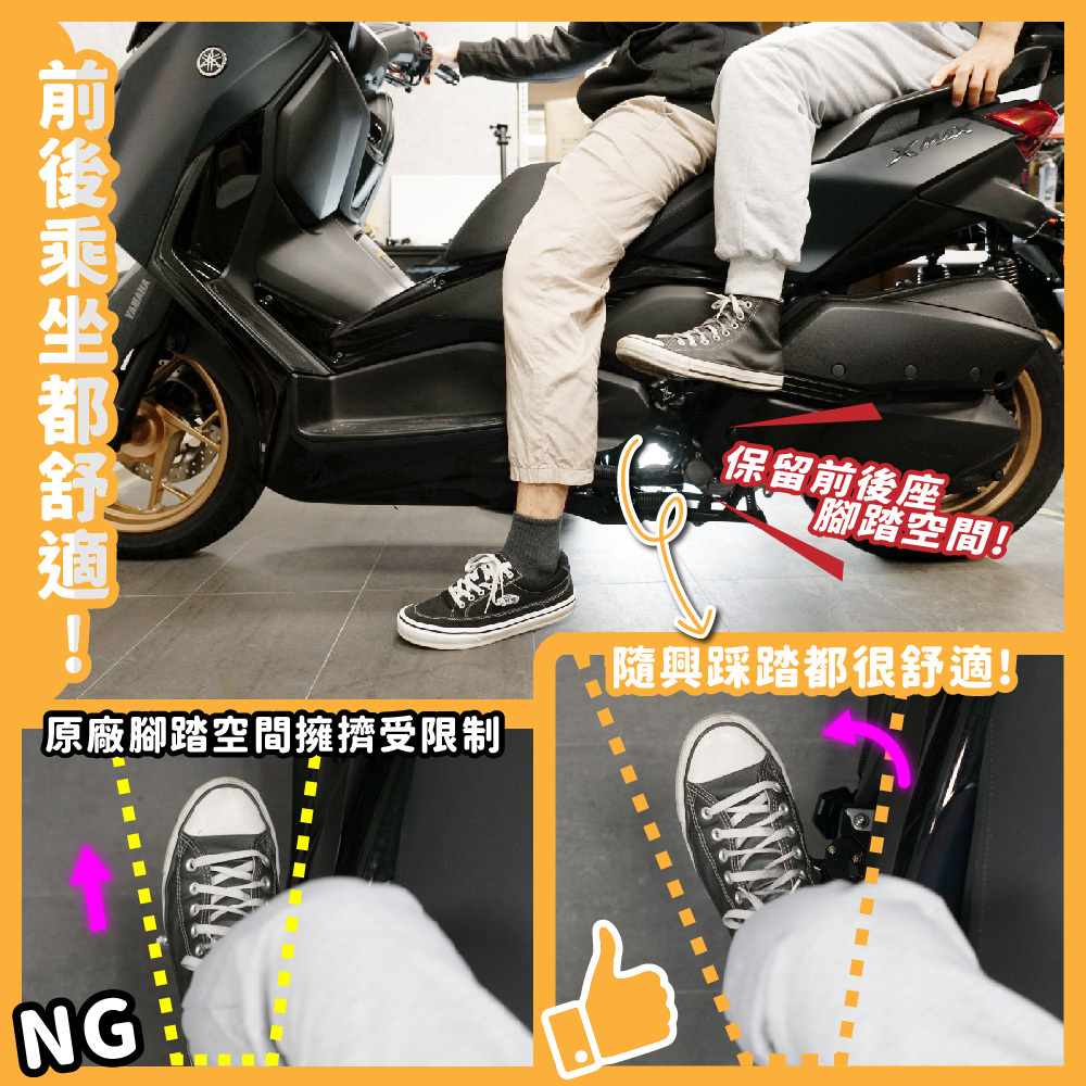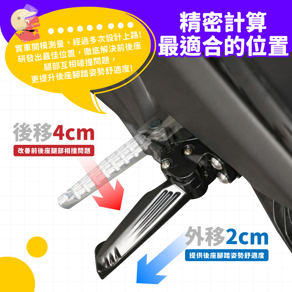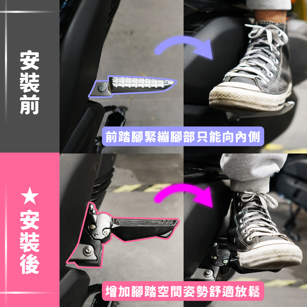 原廠飛旋踏板位置設計不佳,太靠近前座,以致前座腳下放時會與後座腳部碰撞~