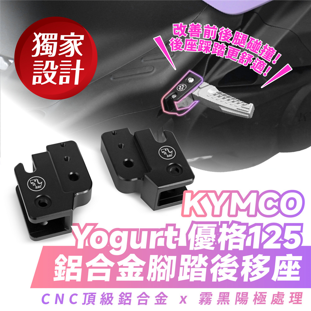 KYMCO YOGURT 125適用的鋁合金飛旋踏板後移座,專為提升改善後座乘客舒適度而設計。這款踏板後移座採用高強度鋁合金材質,具有輕巧且耐用的特點,能有效減少車輛重量,完美適配KYMCO YOGURT 125,安裝簡便,無需額外改裝即可輕鬆安裝,直接替換原廠踏板座。無論是日常通勤還是長途騎行,鋁合金飛旋踏板後移座都能有效提升整體騎行體驗,增加穩定性與舒適感,減少騎行過程中的不適感。