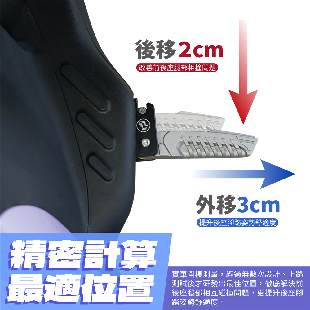 原廠飛旋踏板位置設計不佳,太靠近前座,以致前座腳下放時會與後座腳部碰撞~