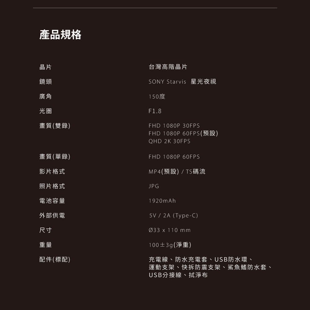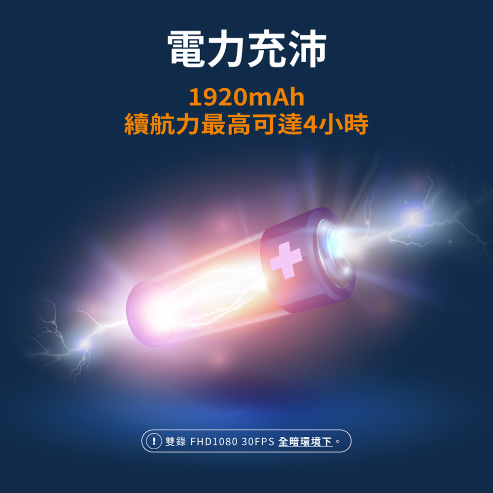 續航力:1080P-30FPS 約4HR / 1080P-60FPS 約3HR / 2K-30FPS約3.3HR